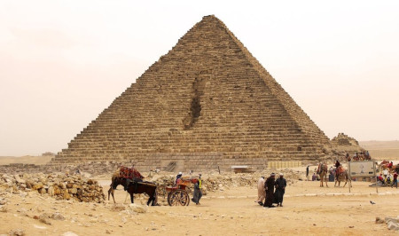 Піраміда Менкаура, найменша з трьох головних пірамід Гізи, побудована близько 2490–2472 років до н.е. для останнього фараона IV династії. Вона відома тим, що її зовнішнє гранітнє оздоблення так і не було завершено – лише сім рядів збереглися біля основи.