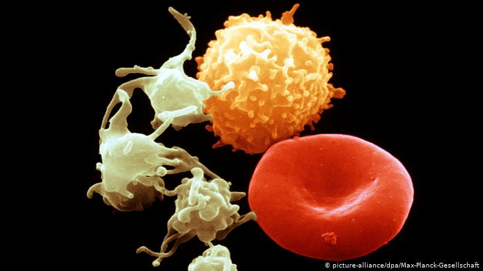 Це мегакаріоцити – так звані клітини-попередниці тромбоцитів, які відіграють ключову роль у системі згортання крові. Мегакаріоцити зазвичай розташовані в кістковому мозку. Там вони трансформуються в тромбоцити, які потім потрапляють в кров.Клітини крові зі зображення мікроскопа, забарвленого на комп’ютері: еритроцити (червоні), лейкоцити (жовті) та тромбоцити (зеленуваті)