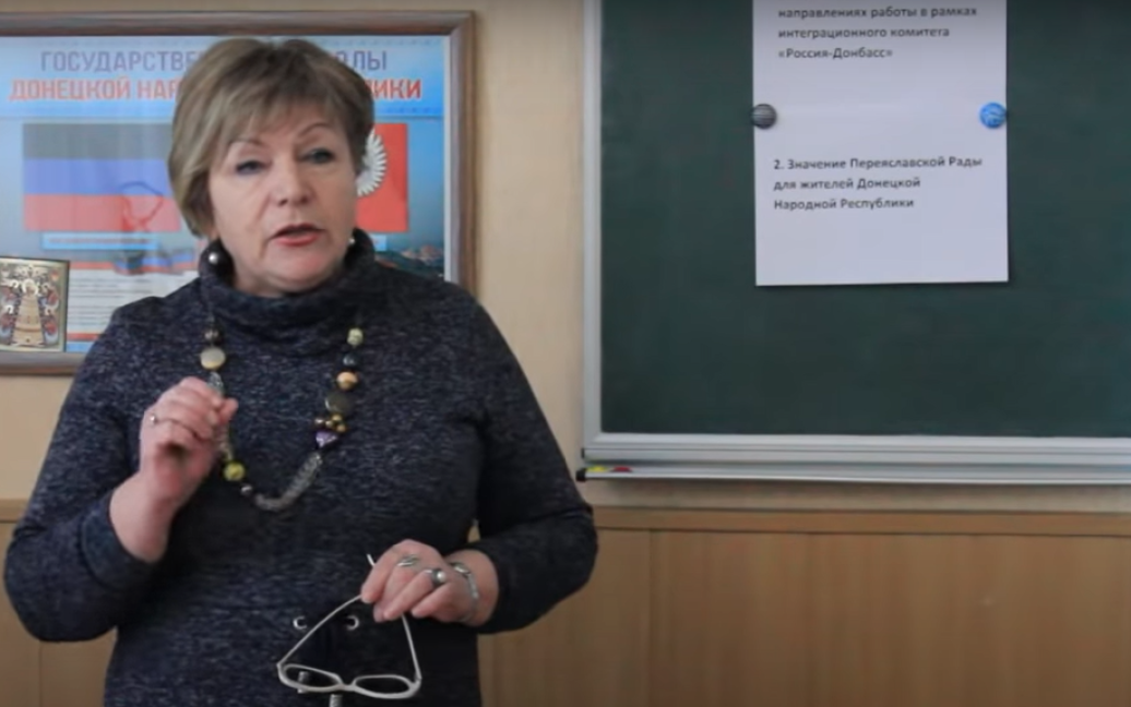 Жінка розповідає школярам про «важливі події в житті нашої держави, нашої республіки», маючи на увазі так звану «ДНР». Вона каже учням, що «потрібно знати, чим живе наша республіка».
