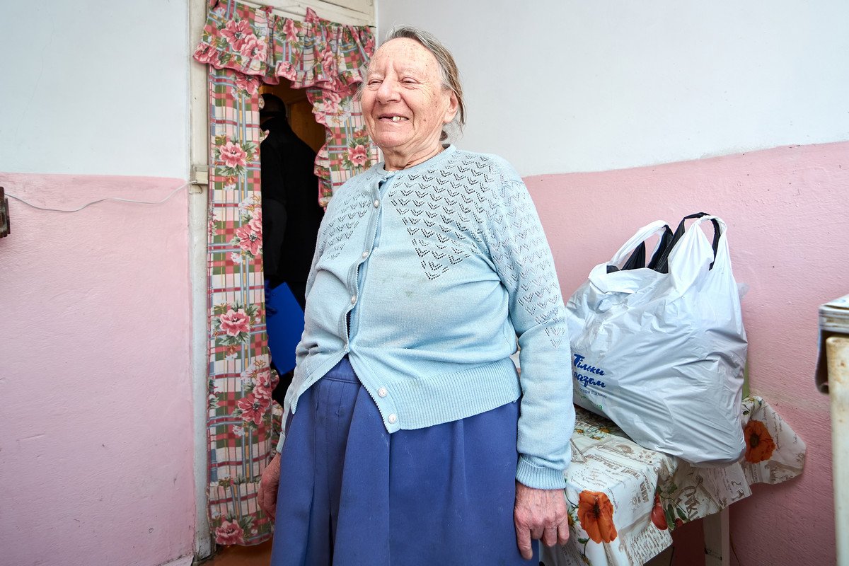 Дитина війни, ветеран праці Софія Літовчук майже не бачить. Відновити зір уже не можна. Живе сама, молиться Богу й все-таки не опускає рук через непросту старість.«Я з родини переселенців. Все життя пропрацювала в торгівлі, була завідувачкою магазинів, працювала на овочевій базі. В роботі завжди була чесна і справедлива. Тато мене вчив так: хто на тебе каменем – ти на того хлібом. Так я життя прожила, шкоди нікому не робила, – розповідає про себе Софія Мефодіївна. – Маю двох доньок, які іноді навідуються до старенької матері. Щоправда, їм теж живеться нелегко, роботи зараз немає, в однієї інвалідність. Тому я дуже задоволена, що мені принесли стільки їжі, тепер матиму запас, матиму що готувати. То велика поміч для мене».«Самій не віриться, що скоро матиму 82 роки. Життя було трудне, особливо після війни, коли хліба не вистачало. І я пам’ятаю, як тато купив маргарину і ми помазали ним хліб… То ви знаєте, я й зараз так іноді люблю купити собі маргарину й так їсти. І я згадую те дитинство… – зі щемом промовляє жінка. – Але нічого, пережили той голод, ту біду, переживемо і нинішню чуму, а головне – страшну війну. Я молюся вранці й увечері, аби нарешті скінчилася та війна, де гинуть безневинні. Прошу в Бога миру й здоров’я всім».