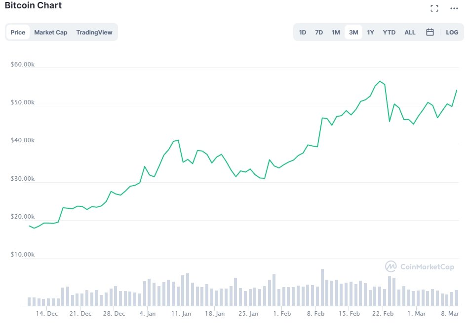 Історичного максимуму в 58 354 доларів він досяг 21 лютого. В результаті його ринкова капіталізація перевищила 1 трильйон доларів.Потім біткоїн впав до 45 тисяч доларів, однак у березні зростання поновилося. 9 березня він виріс на 9% до 54 тисяч доларів, досягнувши самого високого рівня з середини лютого.