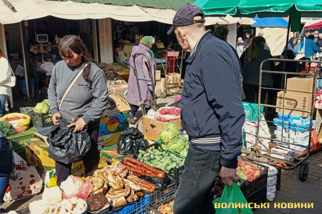 «Отой шматочок, менший, – вибирає жінка і приглядається:– Покажіть який він… А, нє,нє, не треба», – і йде далі.«Ковбаса печена по 300 гривень. Даю пробувати, – каже інша продавчиня і пояснює: – То така колишня, така, як ліверна».
