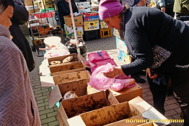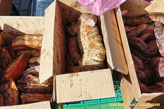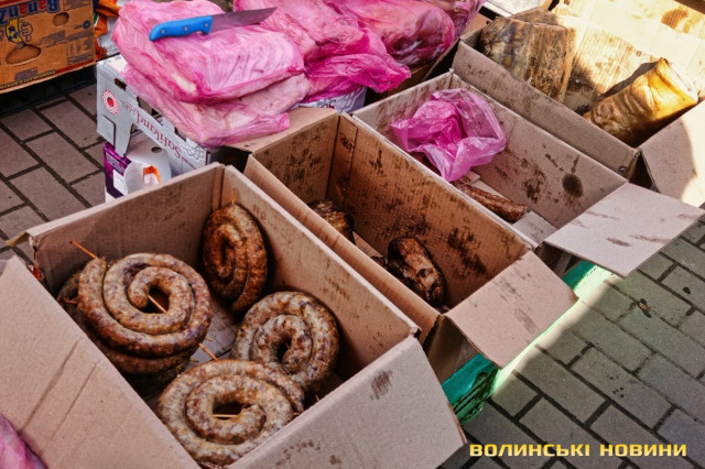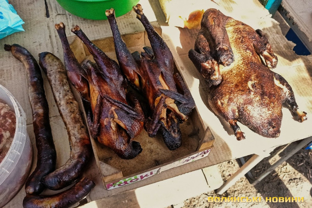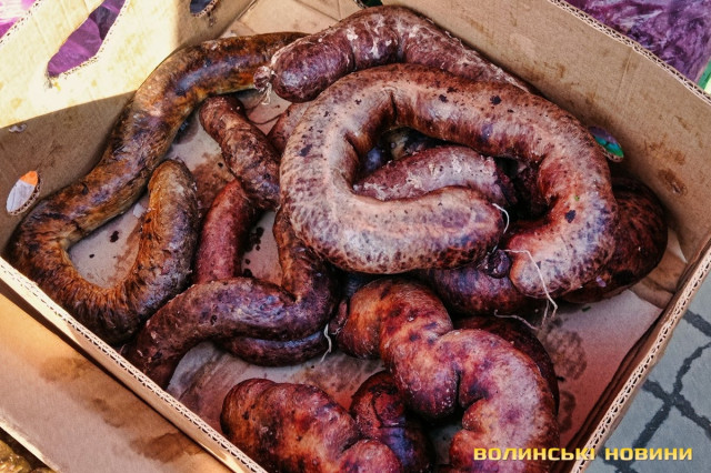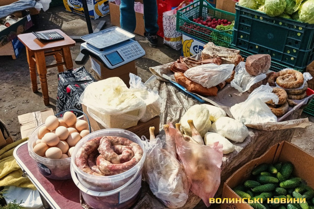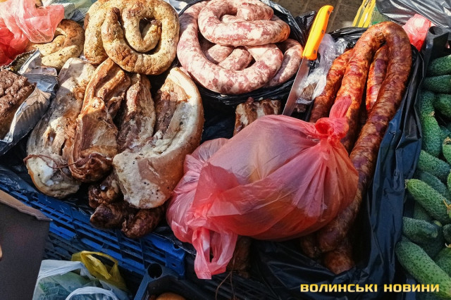 «Зараз я вам зважу, – кладе на вагу невелику пасочку. – Сто вісім. 100 гривень», – одразу скидає ціну.Після випічки очі самі зупиняються на м’ясиві, якого на продаж є доволі. Не звертаємо увагу на фабричні вироби, бо їх пропонують щодня, а от домашні бочки-ковбаска – саме те. Одна пані пропонує печену ковбаску по 350 грн/кг, а сиру для запікання – по 200 грн/кг. Сальтисон можна взяти по 350 грн.«Бочечка якого вам?»– метушиться продавчиня.