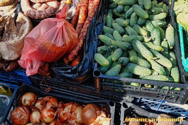 Поряд продають печену ковбасу по 250 і копчений бочок по стільки ж.Ясно, що до столу треба й овочів та зеленини. Пучок зеленої цибулі, кропу та петрушки продають по 20 грн, пучок редиски – по 25-30, салату – по 18, спаржі – по 50. Пучок корінців хрону пропонують по 100 грн. На вагу ціна кілограма овочів наступна: редиска – 90-100, капуста– 100-150, помідори – 100-130-150 (чері – по 150), огірочки – 110-120, морква – 30 (мита – 35), салат – 20 грн.Для десерту можна придбати полуницю – по 270 грн/кг.