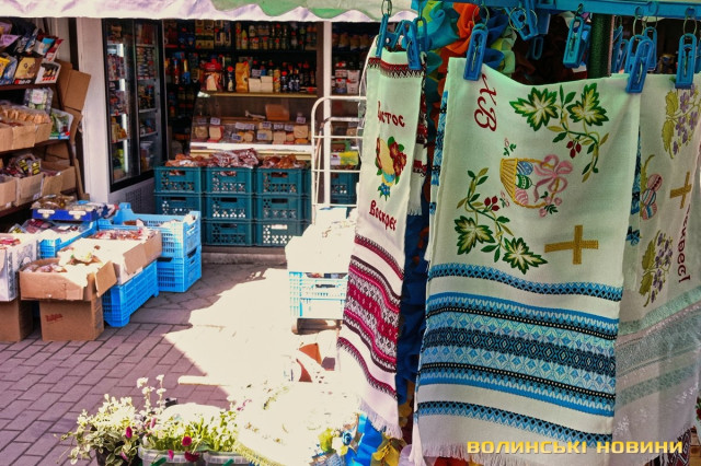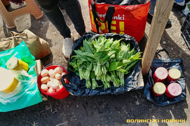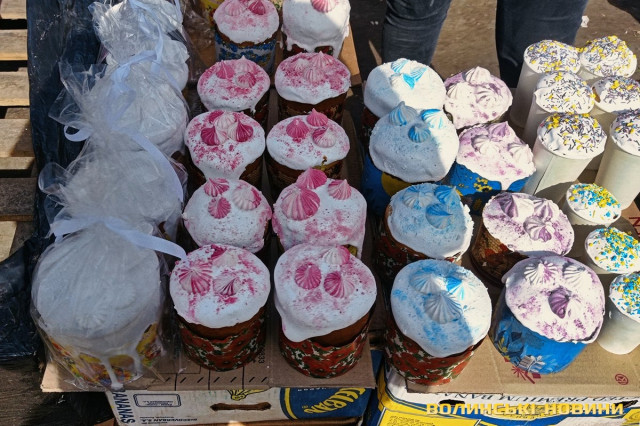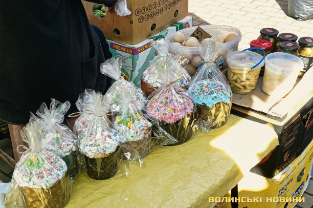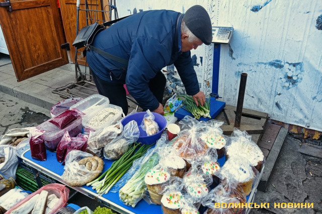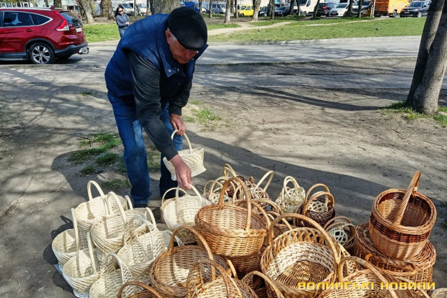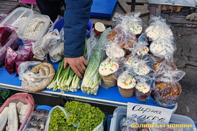 «А я вже напекла», – вдоволено кидає жінка, проминувши співрозмовника.Покупців зустрічає чимала купа плетених з лози кошичків, біля якої сидить чоловік. Середнього розміру виріб коштує 500 гривень.Тут теж є і паски, і м’ясна смакота. Одна продавчиня пропонує нетривіальну випічку, прикрашену зефіром. Залежно від розміру, ціна становить 40, 80, 100, 150, 250 грн.Зелена цибуля йде по 20-25 грн за пучок, салат – по 15, свіженька черемша – по 10. Капусту можна купити за 90, огірки – за 85, помідори – за 110-120-135. За пів літра вже готового до споживання тертого і заправленого хрону просять 100 грн, за наполовину меншу ємність – 50.Сальтисон пропонують по 300. Копчені кури по 250 («Оддам за 200», – одразу скидає ціну продавчиня). Трохи далі чоловік, який каже, що його продукція з домашньої екоферми, пропонує такі ж кури по 200, а копчену качку – за 400 грн.
