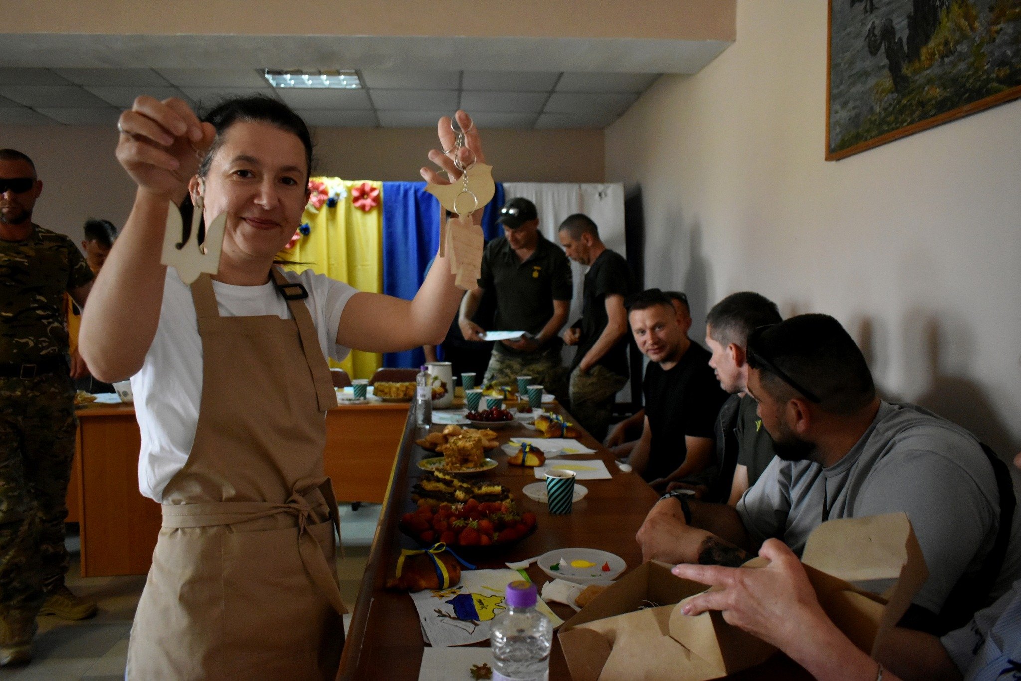 Тим часом у селі Шепель на візитерів уже гостинно чекали в місцевому Будинку культури. Шепельські господині приготували захисникам щедре частування.«Здобні гусочки випікались у справжній сільській печі, аромат стояв на цілу вулицю», – з вдячністю до односельчан розповіла очільниця БК Оксана Козловська.У школі для кожного із воїнів підготували теплі та щирі дитячі малюнки. А майстриня із Княгининка провела майстерклас із творчого розпису. Хтось захоплено, а хтось без поспіху та обережно розфарбували символічні дерев’яні брелоки.«Пташки, ангелики, тризубчики, будиночки та Україна – що кому ближче до душі», – роздавала творче приладдя Ірина Сардак.Представники обласного Центру зайнятості дали практичні поради щодо можливостей для ветеранів, військовослужбовців та їхніх родин у здобутті нової спеціальності, участі у грантових програмах на підтримку власної справи та працевлаштування. Також військові мали змогу дізнатися про освітні програми від речника ЛНТУ, особливості аспірантури, наявні спеціальності, вступ і перекваліфікацію.