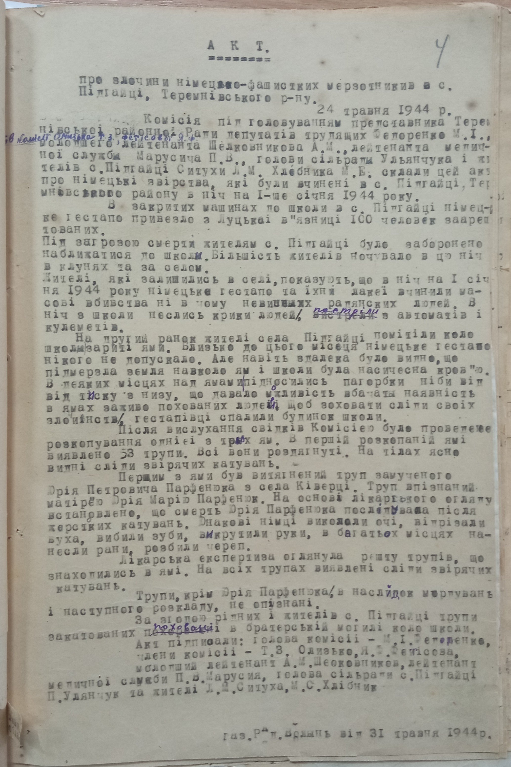Доповнюють показання легіонерів свідчення жителя села Підгайці Никифора С., які він дав слідчому Управління КДБ. За його словами, біля школи євреї будували кухню, а в самому приміщенні облаштовували нари, шили одяг та взуття. У січні 1944 року за новим стилем він помітив біля будівлі школи людей, які копали яму. Але чи це були справді євреї, він у сутінках не роздивився. Близько 22-ї чи 23-ї вечора він почув одиничні постріли й заглянув у вікно. Біля ями стояло 5-10 людей, які щось робили і в когось стріляли. Наступного дня він бачив свіжозасипану яму п’ять метрів завдовжки і два метри завширшки, вона була зрівняна із землею. Никифор С. більше не бачив євреїв, тому дійшов висновку, що їх всіх розстріляли.
