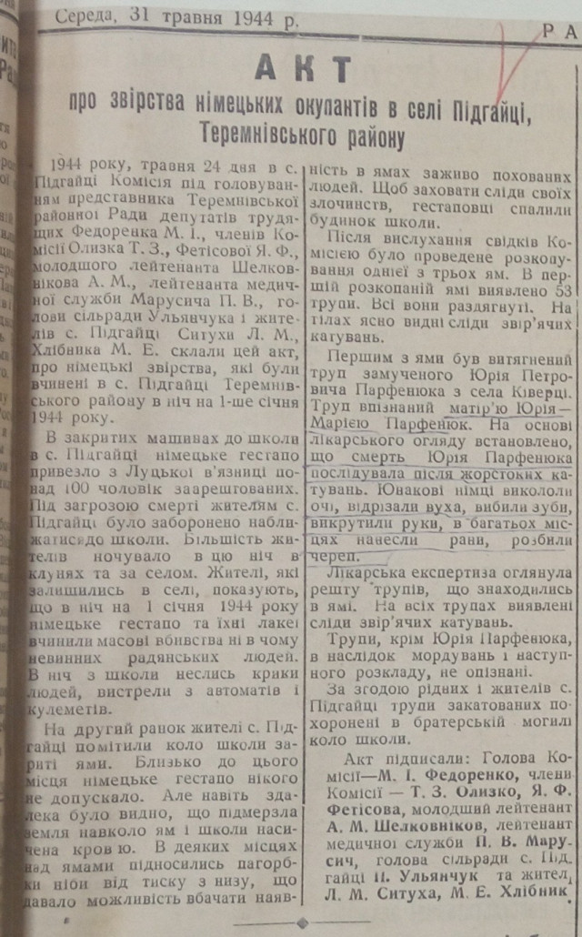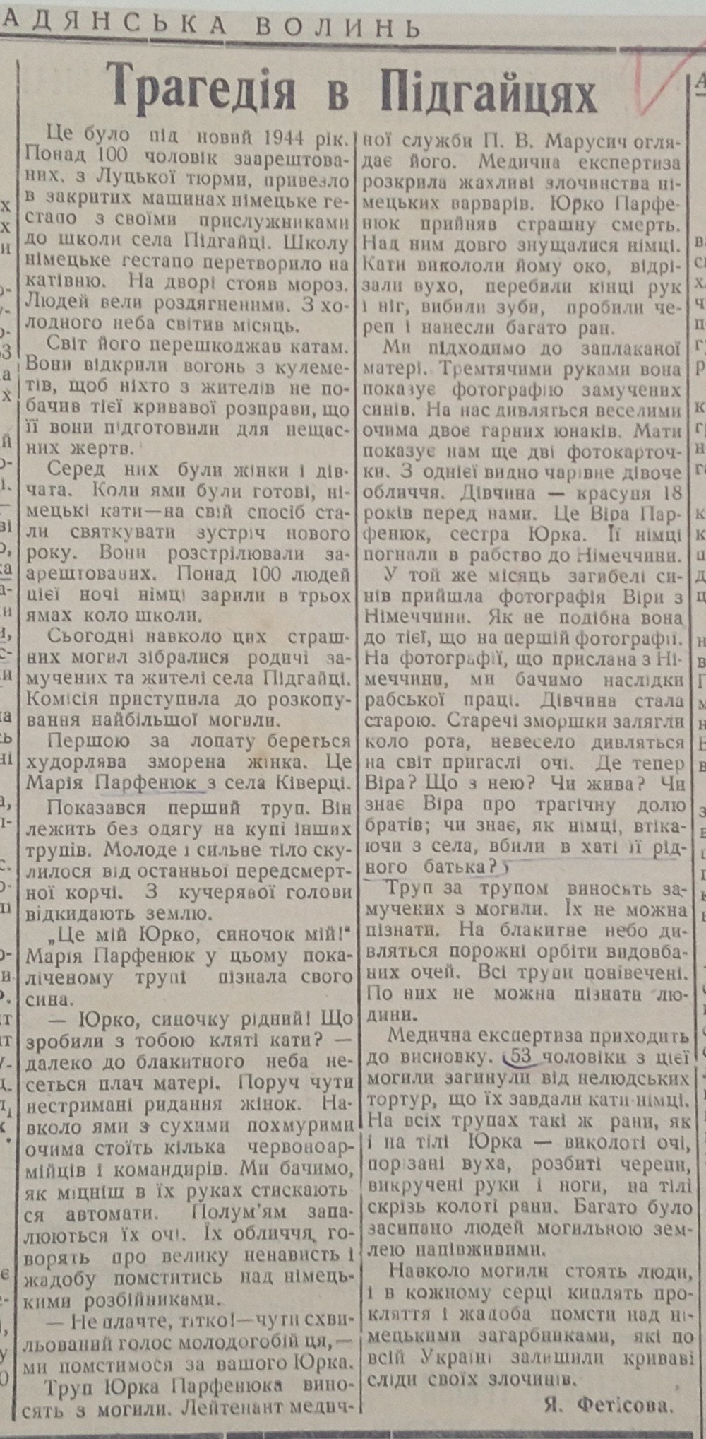 Однією з таких стала новорічна ніч 1944 року для жителів села Підгайці, яка перетворилася на справжню трагедію: саме тут нацистські окупанти розстріляли групу в’язнів із Луцької тюрми. Вони вчинили фактично так само, як і в червні 1941 року це зробили радянські силовики перед відступом.