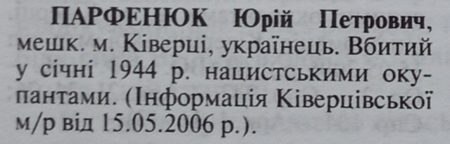 Ім’я Юрія Парфенюка також є в переліку загиблих волинян періоду Другої світової війни, який опубліковано у «Книзі скорботи України». Він зазначений як житель міста Ківерці – українець, якого вбили нацистські окупанти у січні 1944 року. Тому малоймовірно, що ім’я загиблого вигадала радянська пропаганда.Книга скорботи України. Волинська область. Т. 2. Луцьк: Надстир’я, 2010. С. 68