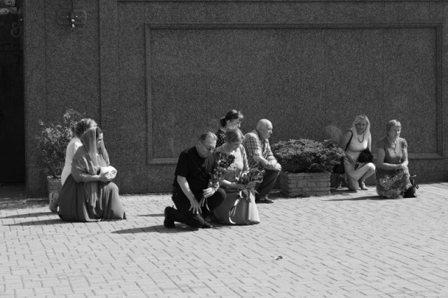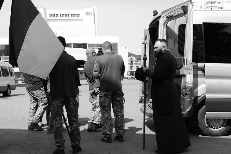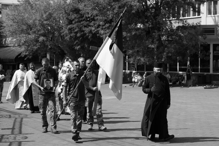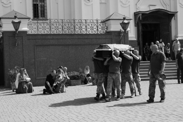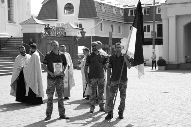 Після завершення богослужіння труну з тілом покійного захисника пронесли Театральним майданом. Біля пам’ятного фотостенду «Герої Небесної Сотні – Загинули за Єдність України» присутні зупинилися і виконали Державний Гімн України.