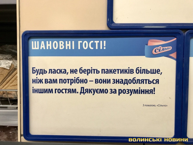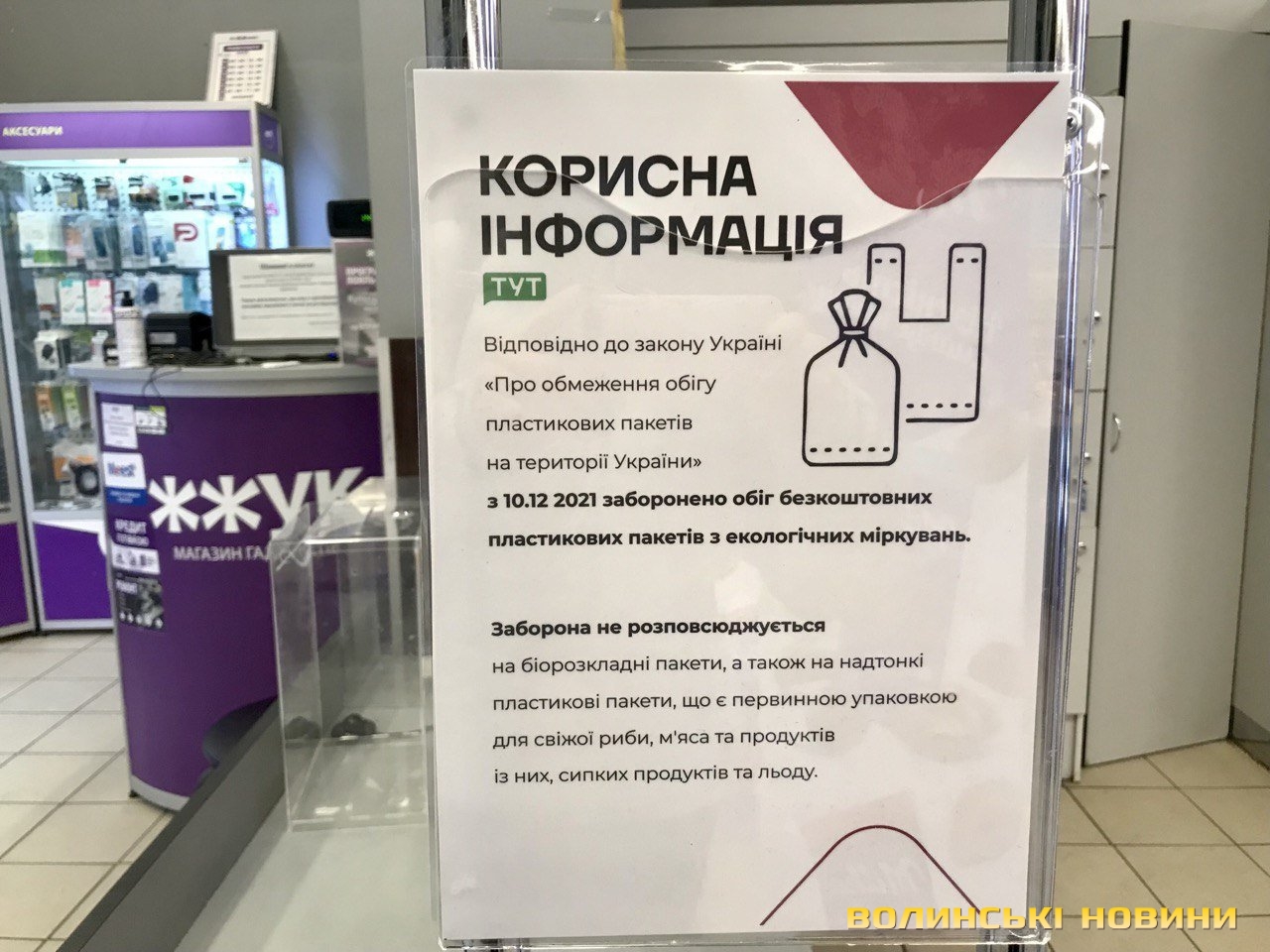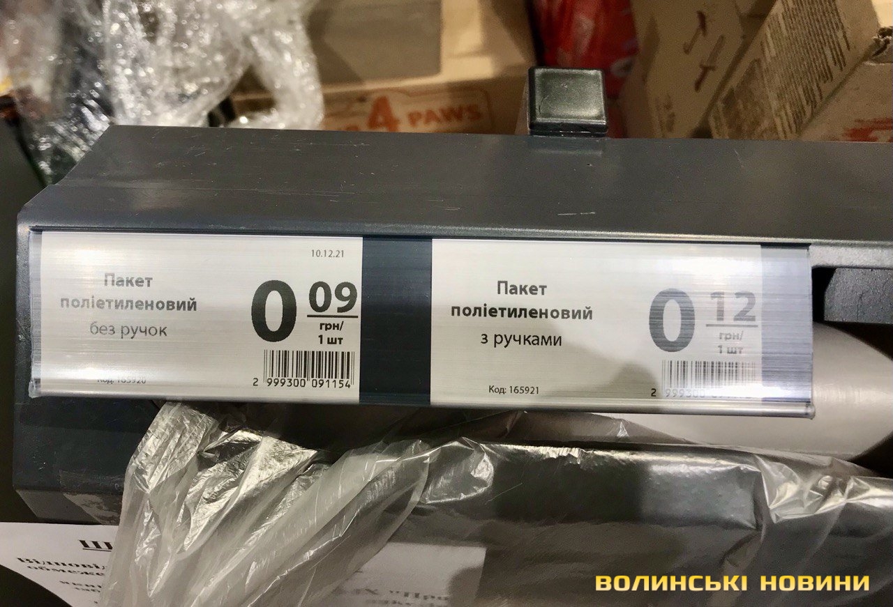 У магазині мережі на вулиці Бенделіані скрізь розміщено відповідну інформацію. Цінники, які інформують покупців про вартість одного поліетиленового пакета, містяться на кожній стійці.Натомість жодного повідомлення про нововведення ми не помітили в супермаркеті «Сільпо», що в самісінькому центрі Луцька.