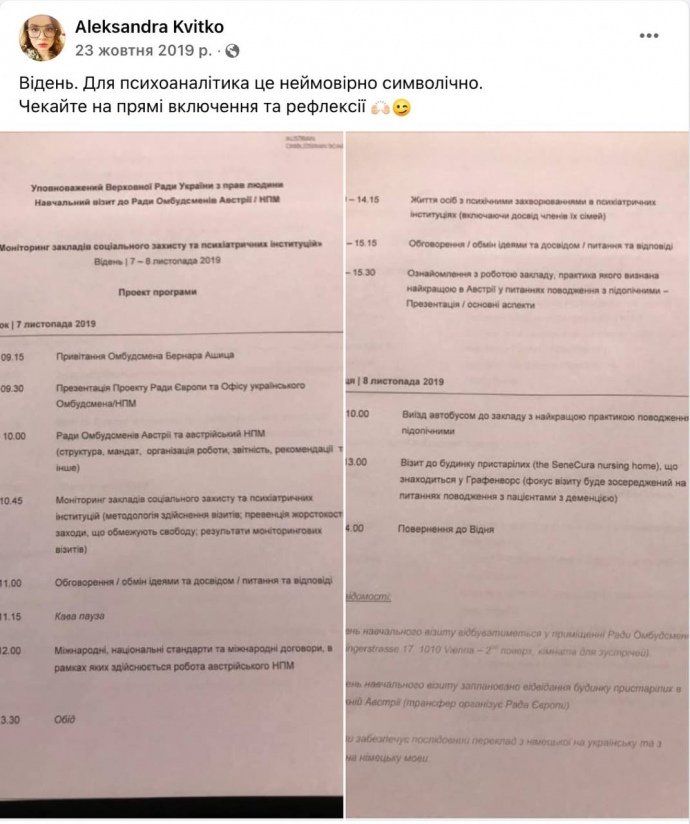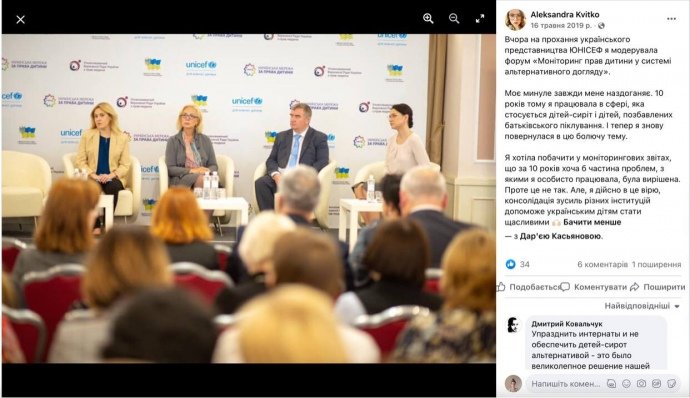 На її сторінці у Facebook можна знайти пости за 2019 рік про поїздку в Австрію. Це був візит омбудсмена з України до європейських колег. І психолог без державної посади долучилась до візиту.У тому ж 2019-му Квітко модерувала український форум щодо прав дитини, про що теж розповідала у соцмережах. Серед організаторів дискусії були Офіс Денісової та ЮНІСЕФ.Фактично Денісова, використовуючи державні повноваження, під час війни забезпечила свою дочку роботою. Формально конфлікту інтересів тут немає. Родині вдалось уникнути його завдяки тому, що Квітко отримала контракт із ЮНІСЕФ, а не посаду в підпорядкуванні Денісової.