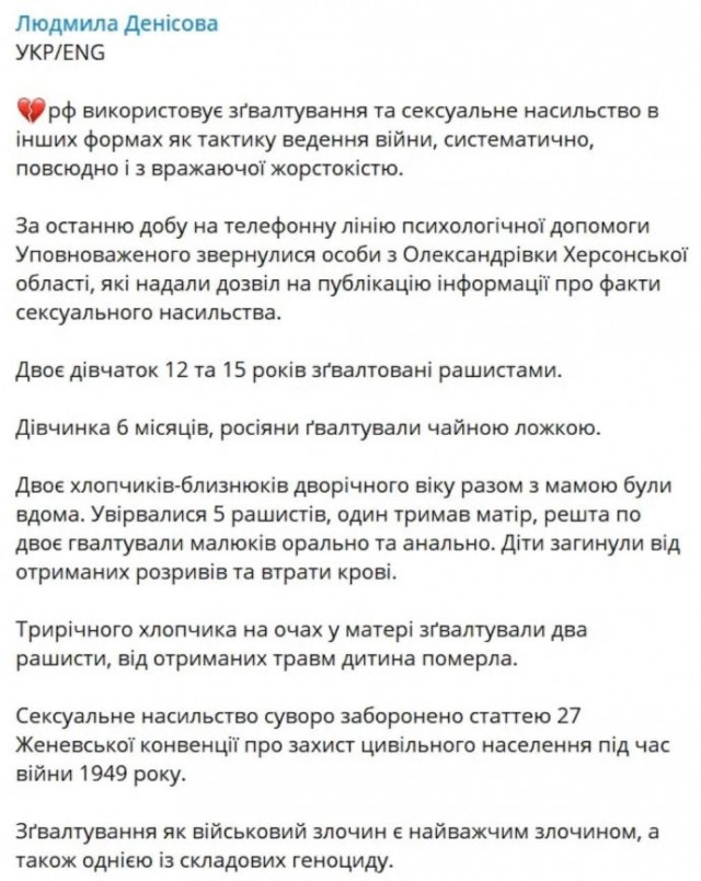 Пізніше вони почали з'являтися й на офіційних сторінках Офісу омбудсмена та в заявах Денісової. Ці розповіді пробирали жахом до кісток: групові наруги над дівчатами перед очима у матерів, зґвалтування малюків і немовлят чайною ложкою чи свічкою.
