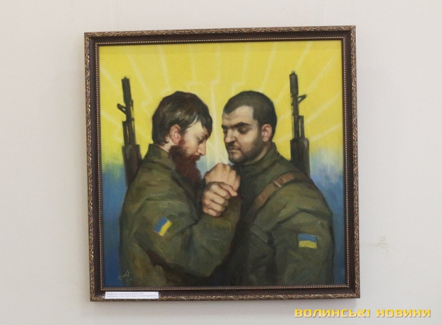 Окрім воїнів минулих епох в експозиції можна побачити портрет воїнів батальйону «Азов» з традиційним гладіаторським вітанням. На створення картини авторку надихнула книга «Чорне сонце» відомого сучасного письменника Василя Шкляра. Це – реальні особи реальної війни, в одному з розділів книги розповідається про те, що саме так віталися азовці. У портретах художниця хоче показати основне – внутрішні переживання героїв.