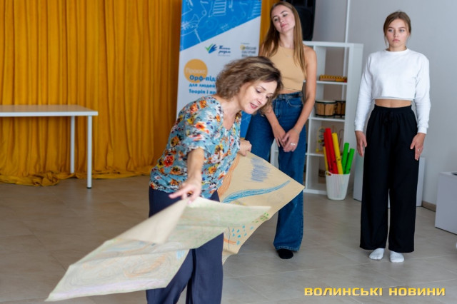 «Я щоразу не знаю, що це буде, – усміхається пані Тетяна. – Така сутність орф-підходу: ми не завжди знаємо, яке буде завершення, фінальна крапка. Можливо, це буде музичний твір, можливо, мінівистава. Ми працюємо з трьома елементами, в які кожен з учасників вносить частинку себе. А ці елементи – повітря, вода і дерево».Киянка Оксана Бадовська уже вдруге приїхала до Луцька з крихітною донечкою. Каже, участь у таких тренінгах – це можливість не лише поглибити власні знання, а й навчитися застосовувати їх не тільки в роботі, а й у стосунках з батьками, з чоловіком, із власними дітьми.«Знаєте, у мене є мрія, аби всі викладачі нашої країни мали змогу отримати оцей досвід того, як налагодити контакт, – ділиться жінка. – Тут просто й доступно розказують, як покроково це робити. І якщо чесно, я вперше отримую такі знання, дуже задоволена, що вдруге сюди приїхала. У мене багаж інформації вже величезний, я постійно занурююся в орф-підхід. Він насправді бездонний. Мене завжди цікавило, з чого почати, далі що робити, до чого я маю прагнути. І за ці два модулі я набула саме цю структуру і тепер бачу, від чого рухатися, що далі й чим я завершую».