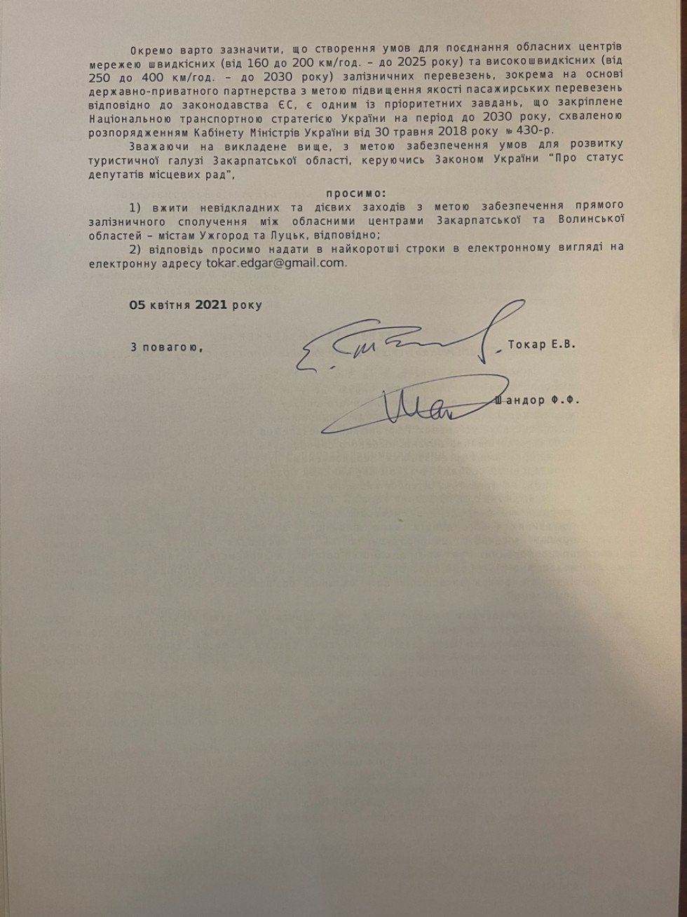 Депутати Закарпатської обласної ради Едгар Токар та Федір Шандор ініціюють відкриття нового залізничного маршруту, який би об’єднав два обласних центри Західної України – Луцьк та Ужгород та дві області – Волинську і Закарпатську, пише Район.Мукачево.