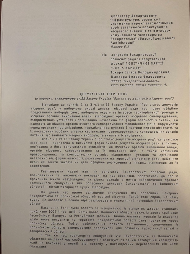 Про це вони написали у депутатському зверненні на ім’я директора Департаменту інфраструктури, розвитку і утримання мережі автомобільних доріг загального користування місцевого значення та житлово-комунального господарства Закарпатської обласної державної адміністрації Едуарда Маляра.