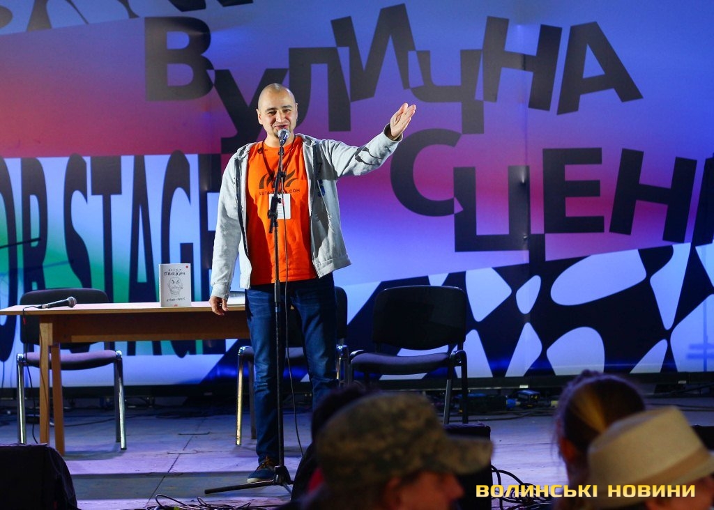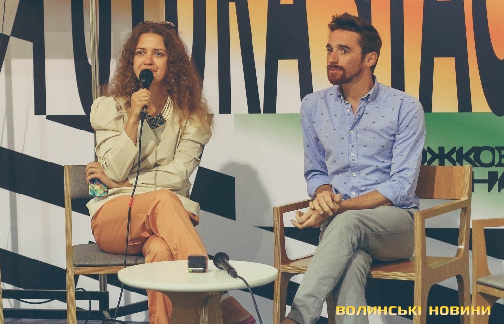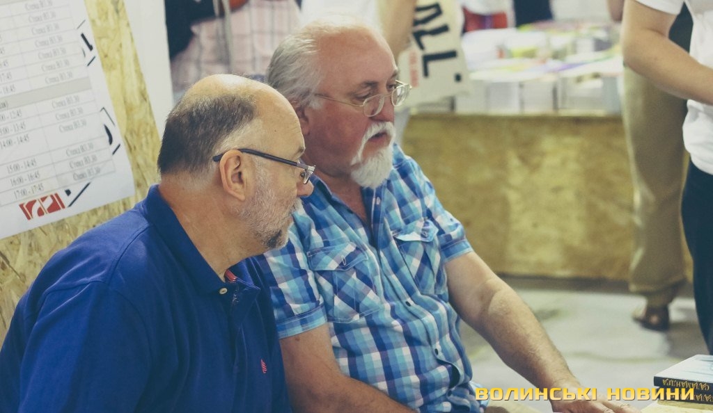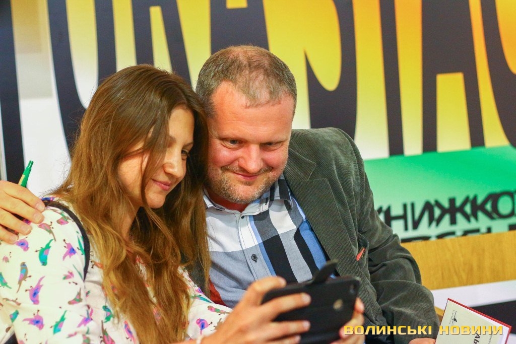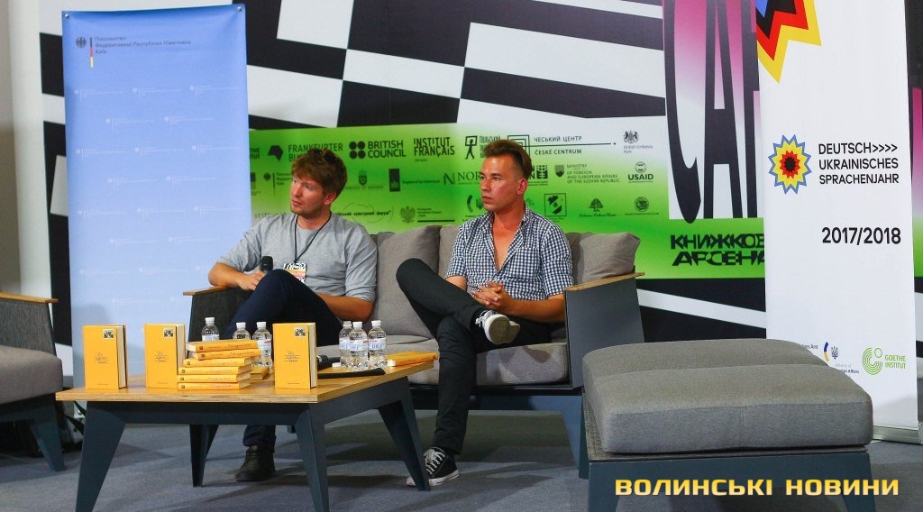 «Я хотів запитати у Кириленка, як можна розмову зробити з Вереснем, якщо він жестами розмовляє? Ці жести ж якось треба передавати словам», - говорить Василь Шкляр. Микола Вересень відповідає, що за 28 років знайомства з В’ячеславом Кириленком той навчився розуміти усі його жести.Один з найдотепніших оповідачів сучасної української літератури Богдан Жолдак презентує книгу «Під зіркою Лукаша» про геніального перекладача-поліглота Миколу Лукаша, який спромігся досягти неможливого – перекласти «Декамерон» Джованні Боккаччо, зберігши авторський синтаксис та відновивши давню українську мову часів написання «Декамерону». Богдан Жолдак розповідає, що у ранньому дитинстві Миколу Лукаша вважали взагалі нездатним промовити ані слова – аж до 5 років він не говорив, а змінило його життя прибуття до рідного села циганського табору та два роки мандрів з циганами: після дивовижного повернення додому хлопчик говорив, але лише циганською. Українська стала другою мовою, яку він вивчив. Лунають і інші маловідомі факти про славетного перекладача: виявляється, він уклав словник українських матюків, рукопис якого, на жаль, вже по його смерті, спалила сестра, боячись «сорому від людей».Пожвавлення серед відвідувачів «Книжкового Арсеналу» викликає прибуття знаменитостей: цілий натовп людей намагаються зробити селфі на фоні Каті Осадчої або з екстравагантним бізнесменом Гариком Корогодським, чи сфотографувати на смартфон Святослава Вакарчука, який оглядає виставку, присвячену утопічним візіям майбутнього. Під прицілами телекамер крокує книжковим ярмарком голова правління НСТУ Зураб Аласанія.Також біля стендів видавництв можна було побачити письменників Андрія Кокотюху, Юрія Винничука, Андрія Куркова, Степана Процюка, Мирослава Дочинця, Володимира Єшкілєва, Антіна Мухарського та інших.Ґрунтовне академічне дослідження сороміцького фольклору, який збирав Федір Вовк, презентували Марія Маєрчик та Олена Боряк. Для підготовки книжки довелося перекласти з французької дослідження цього відомого науковця, які наприкінці19-го-на початку 20-го століття публікувалися у спеціалізованому французькому журналі. До книги також внесли короткий словник єврейської лайки мовою їдиш.На вуличній сцені презентує нову збірку «Навісні пісні» «геній людства та просто красівий мужчіна» Артем Полежака. Один з віршів, який він читає, є промовою старого мавпуна до нащадків, які зрадили «традиційні цінності» та почали ходити на двох ногах. За презентацією спостерігає автор книг про пригоди мавпо українця павіана Томаса Сироти Іван Семесюк.«Отримайте по черепу від автора!»- вигукує, стоячи за стендом видавництва «Люта справа» автор роману «Череп» Олег Шинкаренко.Творець мегапопулярного у мережі фейсбук персонажа Гуся Надьожна (Надійка Кушнір) роздає автографи дітлахам: головним персонажем її нової книги став Зуб.Діти та дорослі шикуються за автографом казкаря Сашка Лірника, який презентує другий том своїх казок.Видання про одного з найкращих українських інтелектуалів 20-го століття, письменника та літературознавця Ігоря Качуровського, якому довелося багато років поневірятися за кордоном, працюючи робітником в порту Буенос-Айреса в Аргентині, презентують Вадим Скуратівський та журналіст і письменник Віталій Портников.Книгу віршів «Сталіна не було» 