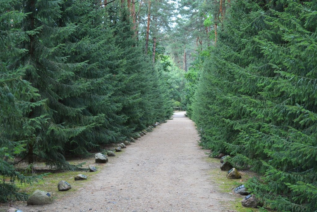 Йдемо алеєю Меморіалу. Вздовж неї попід ялинами, що вишикувалися, немов стражі пам’яті, – камені з табличками, на яких зазначено імена замордованих у таборі євреїв.Гнітюче враження від енергетики цього місця посилює дрібний дощ, що не припиняючись сіється з низьких хмар. Здається, що тебе немов ланцюгами сковує уся скорбота світу, а небо притискає до землі. Відчуття, ніби ось-ось бракне кисню й ти задихнешся від всього того болю, що його довелося пережити ні в чому не винним людям у концтаборі, існування якого згодом заперечували кати єврейського народу.