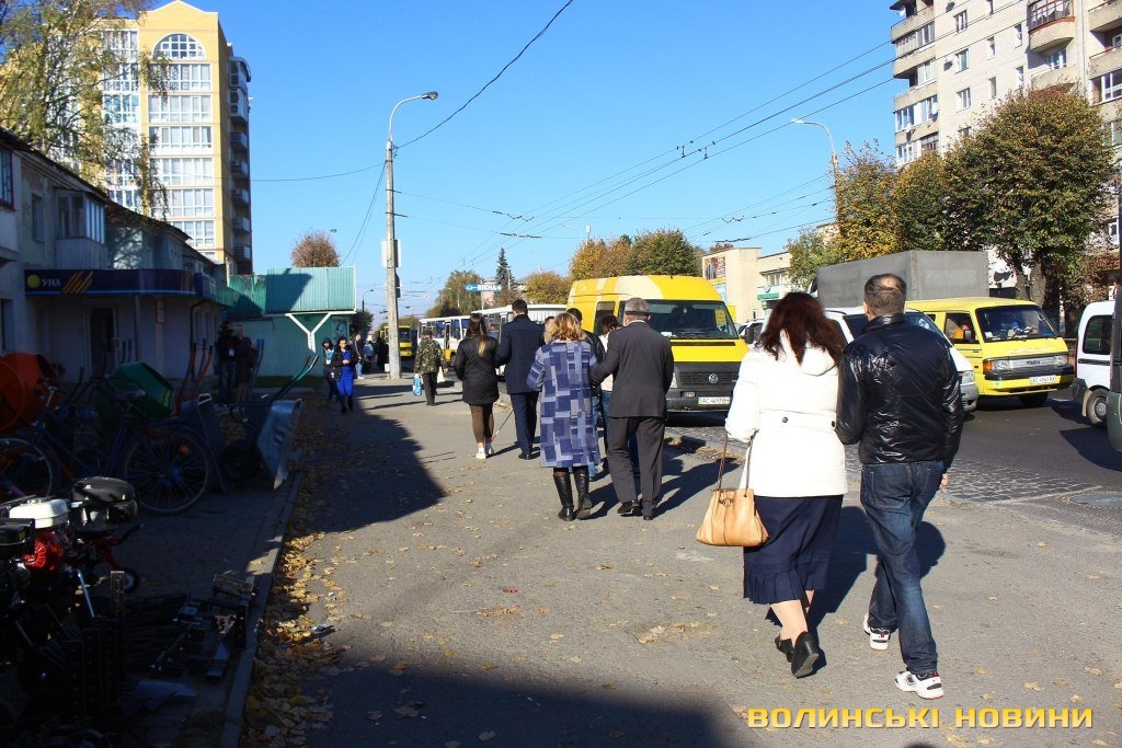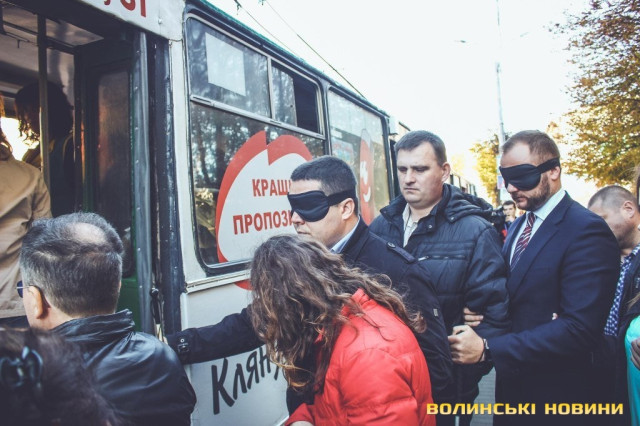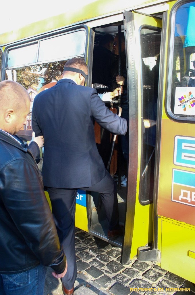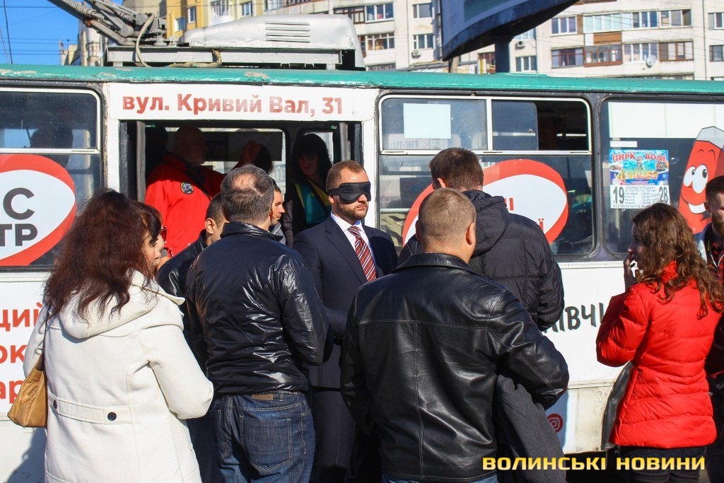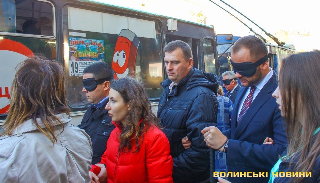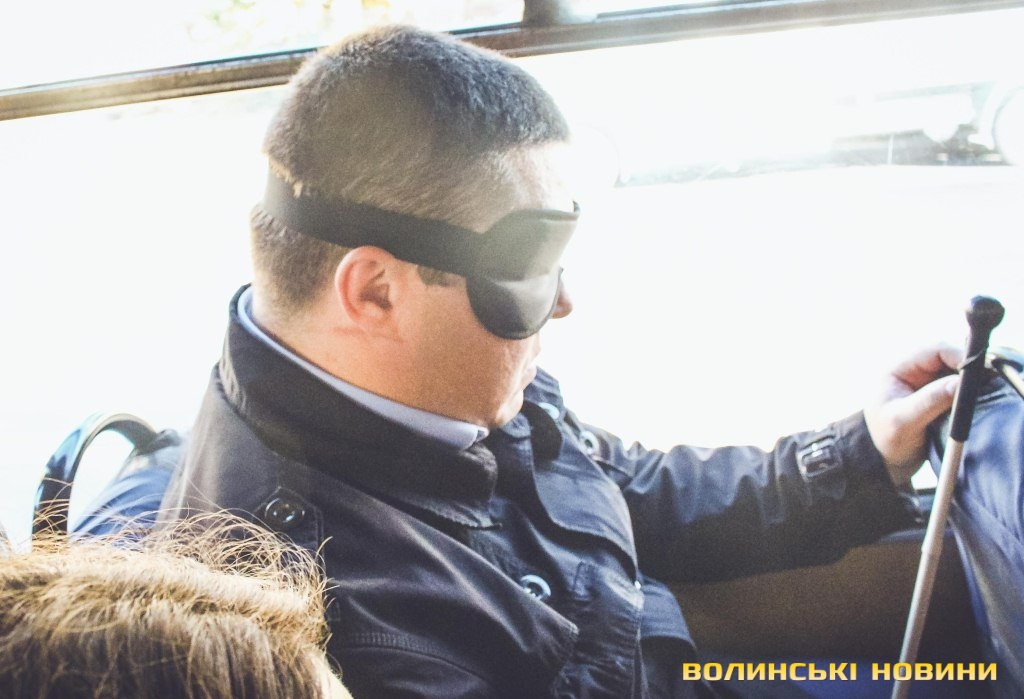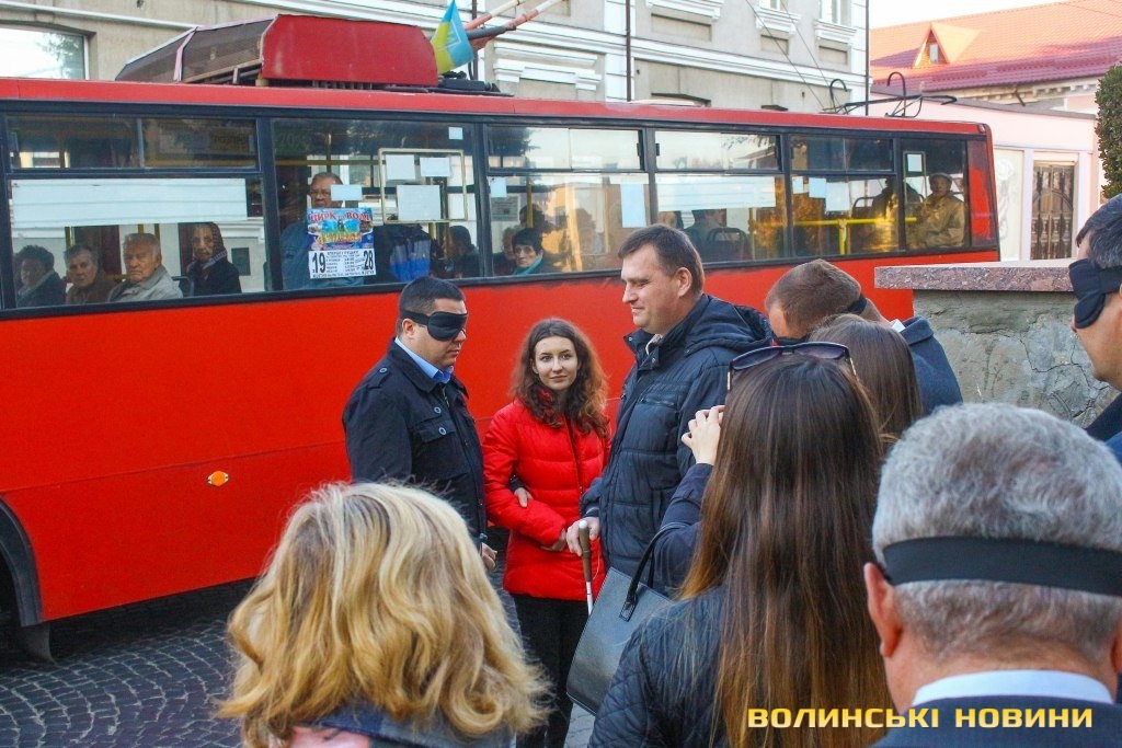 З зупинки громадського транспорту на вулиці Ковельській маршрутним автобусом №32 вирушили до центру міста. Відсутність озвучення зупинок в автобусі водій пояснював тим, що вийшло з ладу обладнання. З Театрального майдану тролейбусом №9 вирушили на проспект Соборності. У тролейбусі з озвученням зупинок перешкод не виникало. Від зупинки поблизу гіпермаркету «Там Там» учасники експерименту пішки пройшли тротуарами проспекту Соборності до перехрестя з вулицею Воїнів-Інтернаціоналістів. Зі слів незрячих, не всі пішохідні переходи на цій вулиці заслуговують на високу оцінку. Так, окремі з них незрячій людині неможливо зауважити, однак на переході, що на перетині з вулицею Кравчука, нещодавно поклали тактильну плитку. Покращує доступність вулиці для незрячих і наявність обмежувачів руху на проїжджій частині.