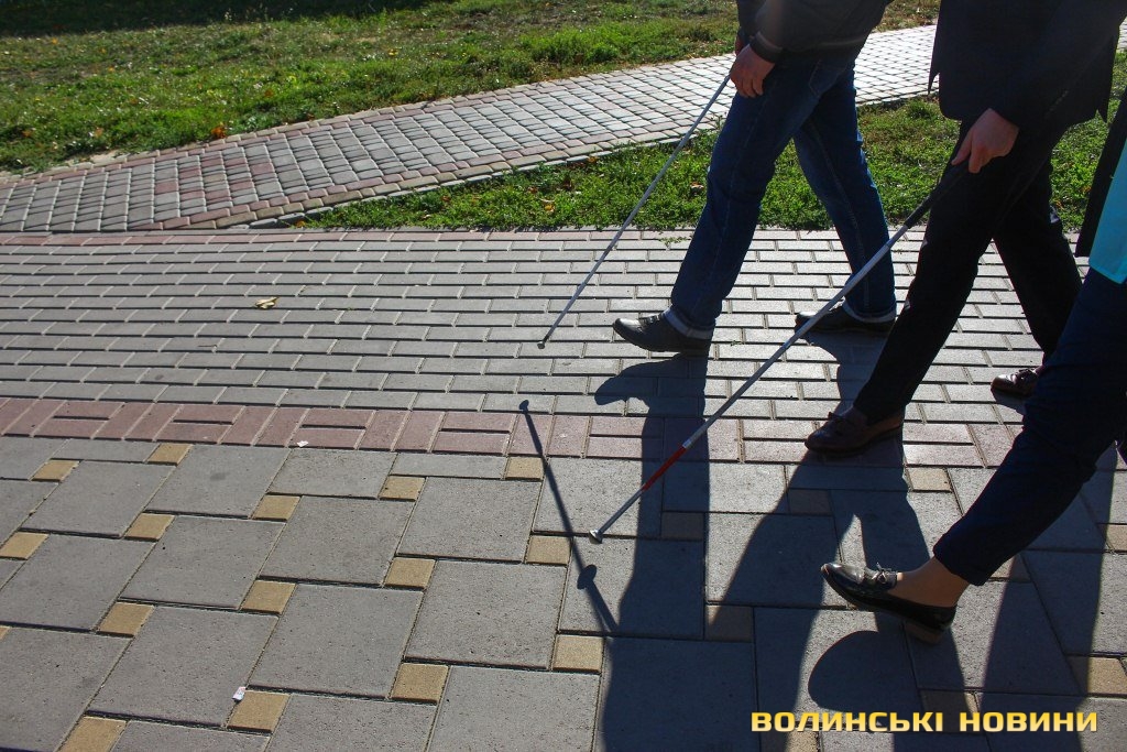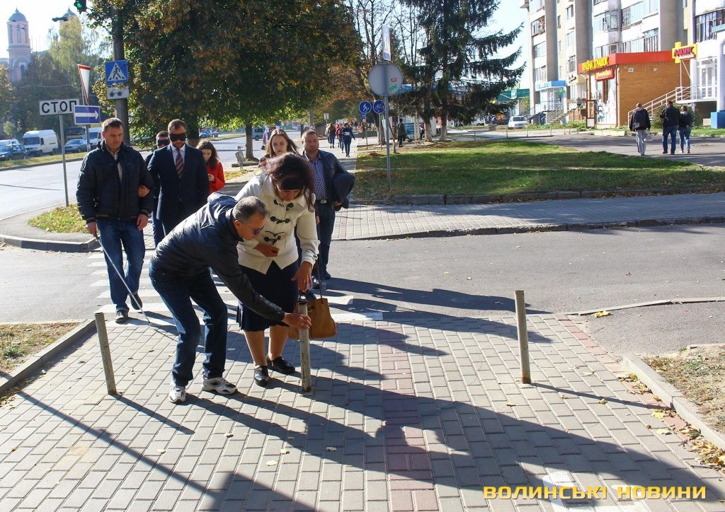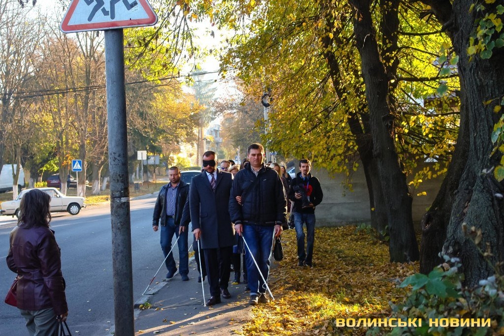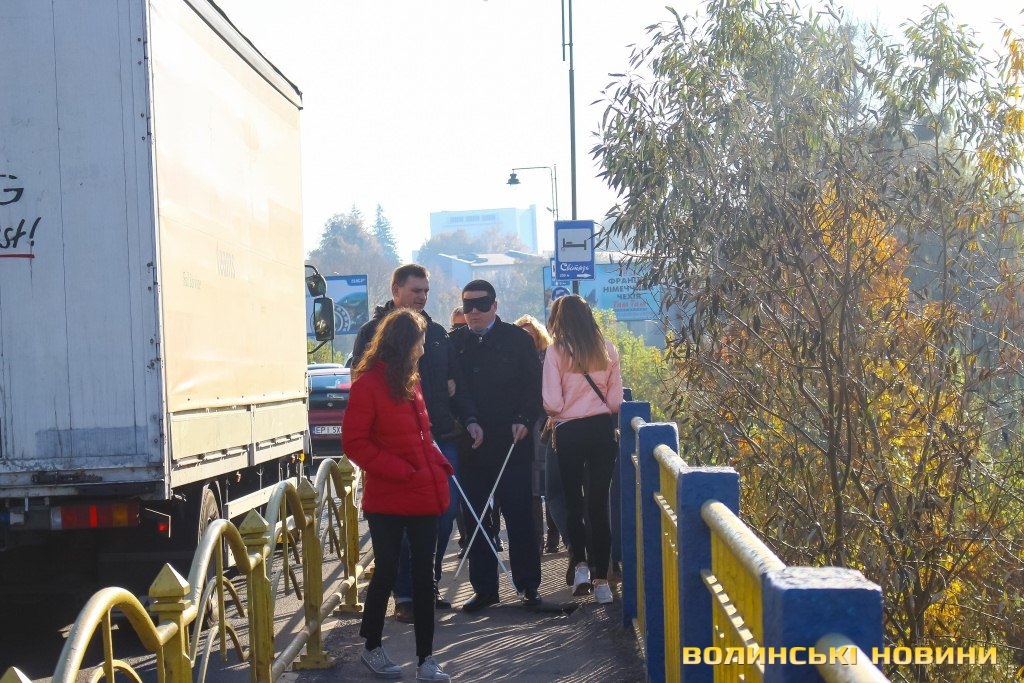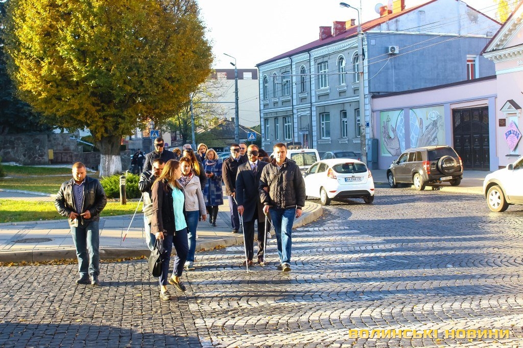 Насамперед від будівлі міськради учасники експерименту пройшли вулицею Богдана Хмельницького, повз будівлю спортивної школи на вулицю Шевченка. Поблизу перехрестя вулиць Шевченка та Набережної нещодавно облаштували острівець безпеки на проїжджій частині та виклали тактильну плитку на пішохідному переході. Відтак пройшовши мостом через Стир попростували вулицею Шевченка до Ковельської. Незрячі учасники експерименту звертали увагу представників влади на існуючі недоліки в плані доступності вулиці, зокрема, відсутність звукових сигналів на світлофорі. А саме на вулиці Шевченка розташована будівля УТОС, де відбувається чимало заходів для незрячих.