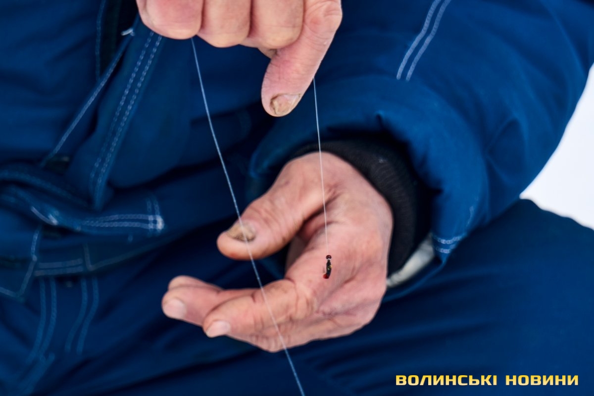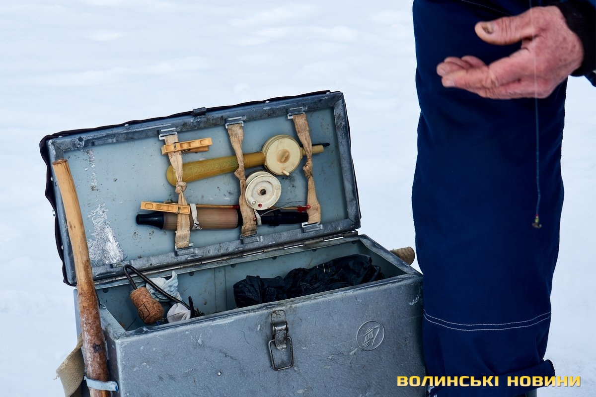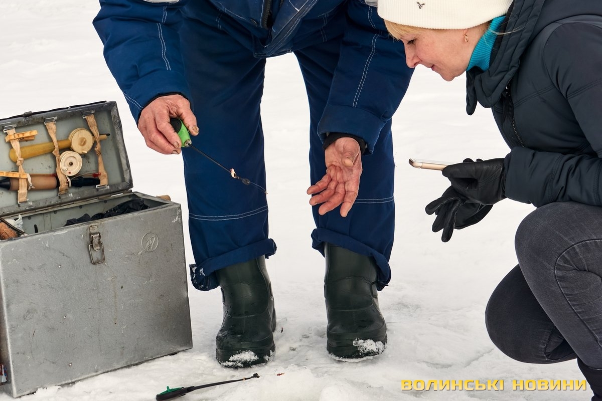 Минаємо чиїсь акуратно розставлені жерлиці з червоними прапорцями. Поки що вони нерухомі. Їх власник пан Юрій каже, що він – аматор, виходить на лід рідко, заради задоволення. Хоча його екіпіруванню позаздрить будь-який рибалка.Неподалік від нього – Григорій. Він – рибалка з чималим стажем, побував на багатьох водоймах Волині – і на річках, і на озерах. Каже, перевагу віддає риболовлі на блешню, бо то – справжнє мистецтво. Таку приманку, зізнається, ніколи не купує в магазині, бо найкраща блешня – виготовлена руками, сто разів перевірена вдома у ванні. Їх для нього виготовляв нині вже покійний друг, нині ж робить сам.«Зараз хочу ще зробити балансир, який шумить – поранена рибка. Коли він падає, то йде від лунки на метрів два, – пояснює. – Найбільший окунь, якого вдалося упіймати – 1 кілограм 200 грамів».