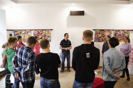 На першому занятті Юрій Коваленко показав учням школи як правильно розминатися перед роботою з голосом, різноманітні вправи для покращення артикуляції, а також розповів, що потрібно робити, щоб привести мовний апарат у стан «бойової готовності».