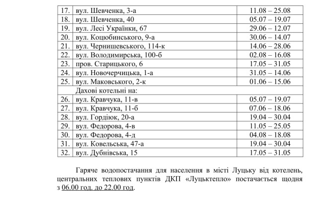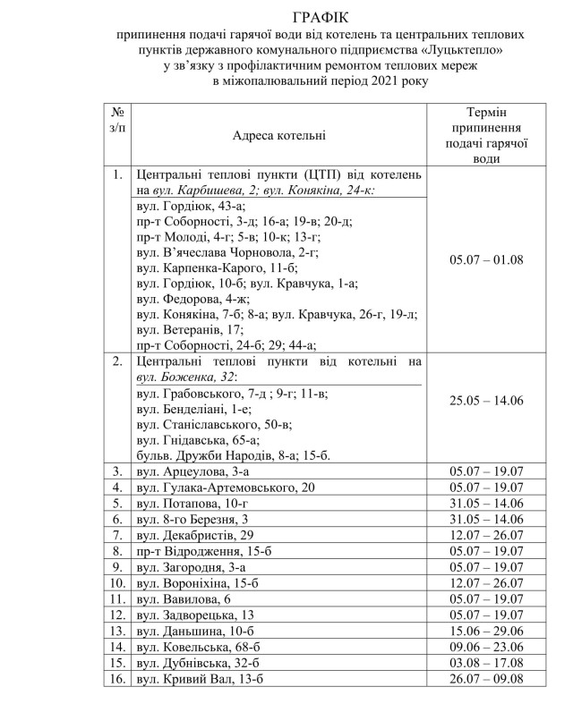 Як ідеться у відповідному проєкті рішення, у зв’язку з щорічним проведенням профілактичних ремонтів теплових мереж, відповідно до Закону України «Про житлово-комунальні послуги», виникла необхідність розглянути та затвердити графік припинення подачі гарячої води від котелень та центральних теплових пунктів ДКП «Луцьктепло» для мешканців міста Луцька на 2021 рік.Члени виконкому підтримали проєкт рішення і затвердили графік припинення подачі гарячої води від котелень та центральних теплових пунктів ДКП «Луцьктепло» у зв’язку з профілактичним ремонтом теплових мереж в міжопалювальний період 2021 року, а також зобов’язали «Луцьктепло» дотримуватися графіка при умові надання послуги з централізованого постачання гарячої води в міжопалювальний період 2021 року.