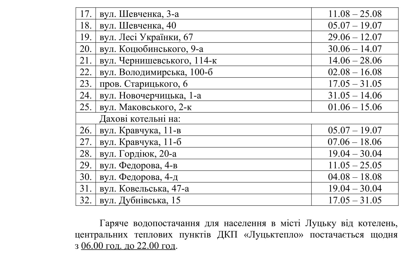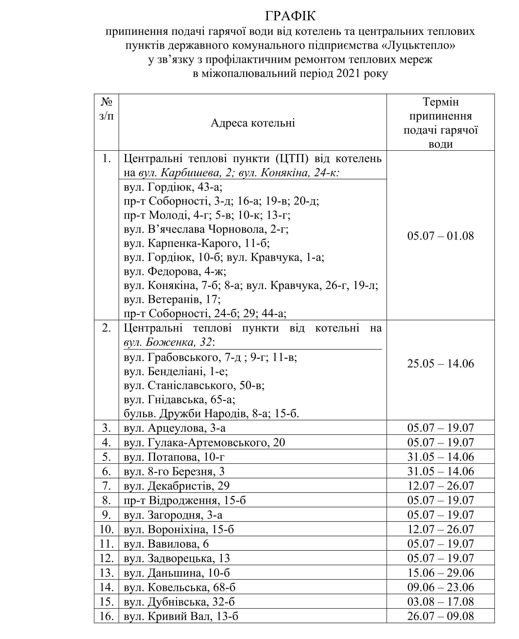 Як ідеться у відповідному проєкті рішення, у зв’язку з щорічним проведенням профілактичних ремонтів теплових мереж, відповідно до Закону України «Про житлово-комунальні послуги», виникла необхідність розглянути та затвердити графік припинення подачі гарячої води від котелень та центральних теплових пунктів ДКП «Луцьктепло» для мешканців міста Луцька на 2021 рік.Члени виконкому підтримали проєкт рішення і затвердили графік припинення подачі гарячої води від котелень та центральних теплових пунктів ДКП «Луцьктепло» у зв’язку з профілактичним ремонтом теплових мереж в міжопалювальний період 2021 року, а також зобов’язали «Луцьктепло» дотримуватися графіка при умові надання послуги з централізованого постачання гарячої води в міжопалювальний період 2021 року.