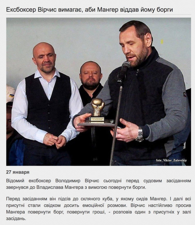 «Вчора всесвітньовідомий український боксер, колишній чемпіон світу Володимир Вірчис прийшов на суд до політика Владислава Мангера, який є обвинуваченим у вбивстві Катерини Гандзюк. Вірчис публічно вимагав у Мангера повернути борг, на що Мангер попросив Вірчиса «не влаштовувати сцен».