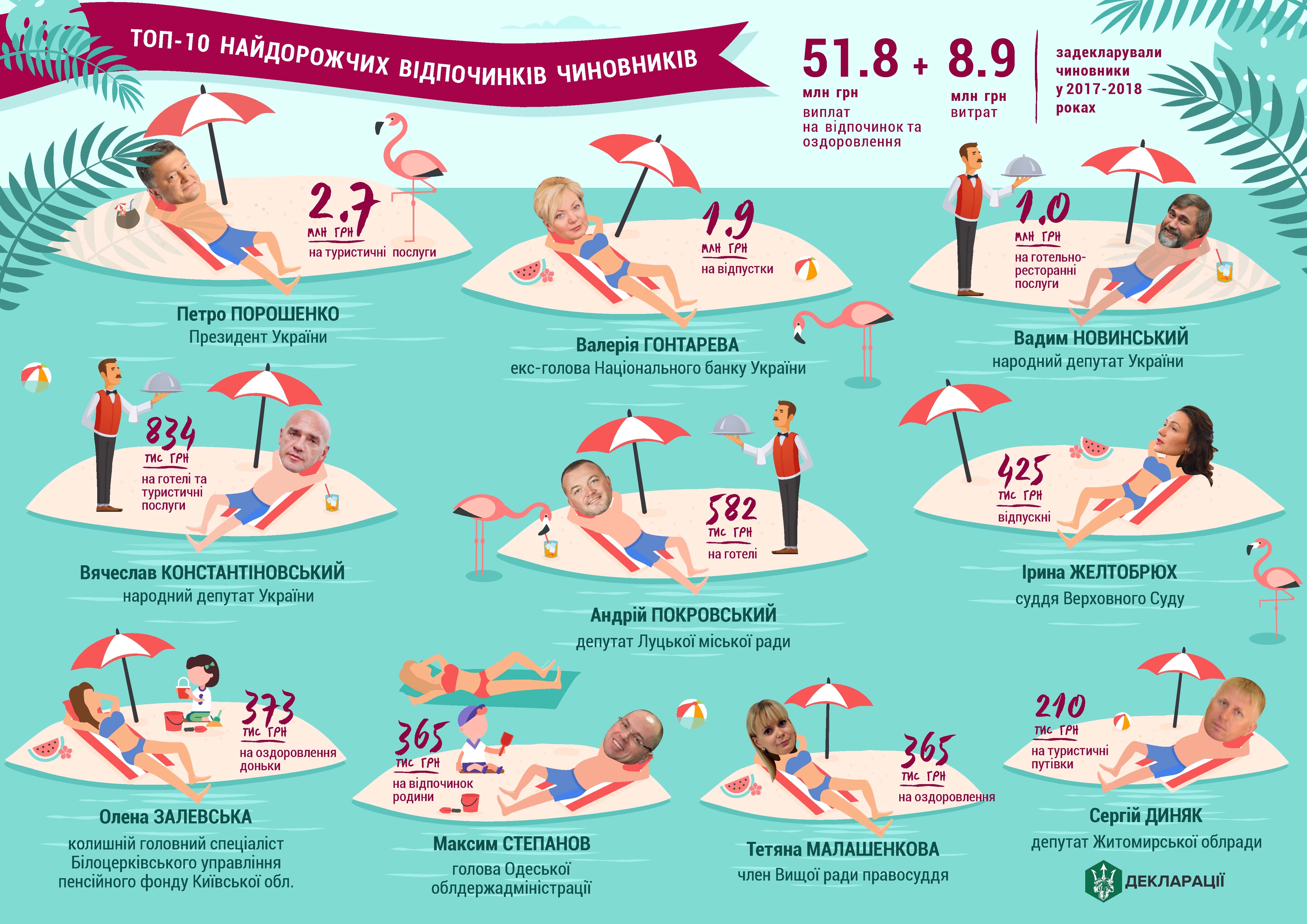 Таємна мальдівська відпустка президента Петра Порошенка взимку наробила чимало шуму в українських ЗМІ. Рейтинг топ-відпочивальників гарант очолив і сьогодні. У своїй декларації за 2017 рік він вказав два видатки на туристичні послуги на загальну суму понад 2,7 млн гривень. Проте, за підрахунками програми «Схеми», повна вартість відпочинку на Мальдівах - разом із чартерними авіаперельотами, орендою острова, харчуванням і додатковими послугами - мала обійтися Петру Порошенку не менше ніж у півмільйона доларів (понад 14 млн гривень).На другому місці опинилася близька до Порошенка екс-голова Нацбанку Валерія Гонтарева. У 2017 році відпочинок родини коштував їй 1,9 млн гривень. А мальдівський вояж сімейства Гонтаревих 2016 року навіть став підставою для розслідування НАБУ за підозрою у декларуванні недостовірної інформації, але наприкінці червня справу було закрито - відпустка нібито обійшлася їм всього у 250 тисяч гривень, тобто нижче порогу для декларування.