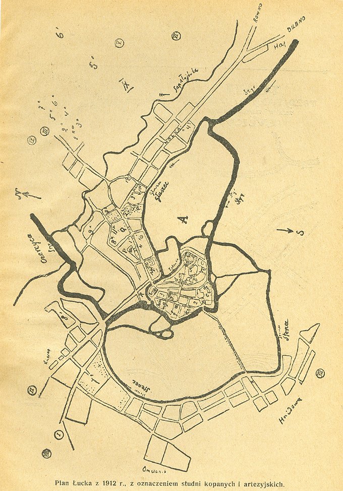 План Луцька 1912 року з позначенням копаних і артезіанських криниць. Зображення з книги Адама Войнича