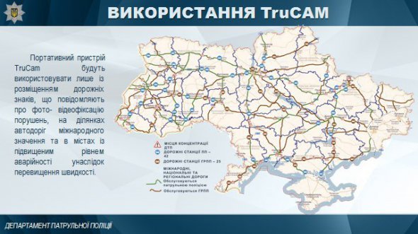 Пристрої вимірювання швидкості TruCam патрульна поліція почне використовувати з 8 жовтня. Робитимуть це в місцях концентрації ДТП та на аварійно-небезпечних ділянках доріг міжнародного значення. Зокрема, у Волинській області радари працюватимуть на трасах "Устилуг-Луцьк-Рівне" та "Київ-Ковель-Ягодин".