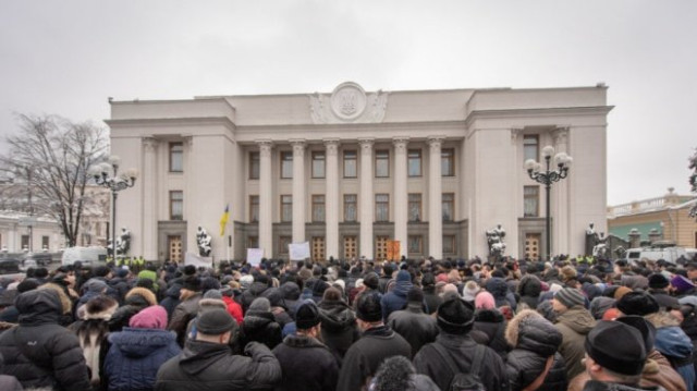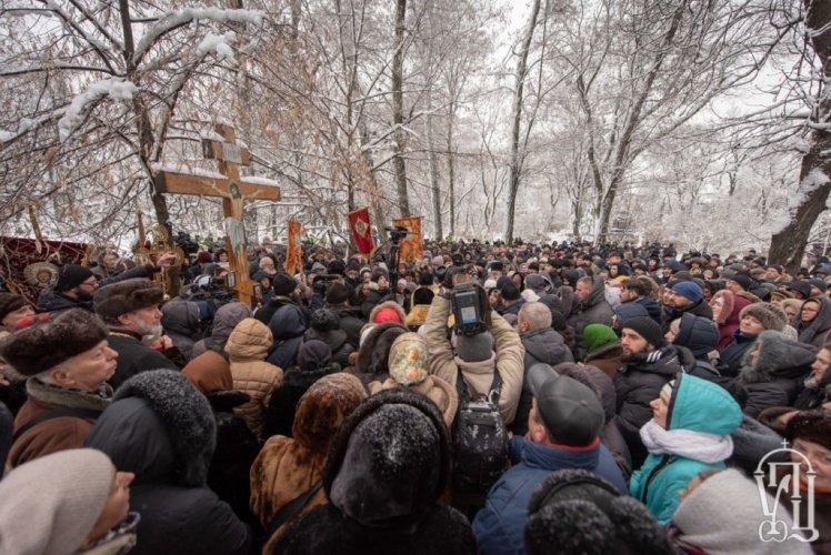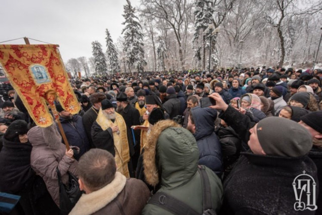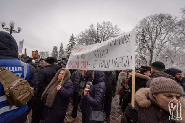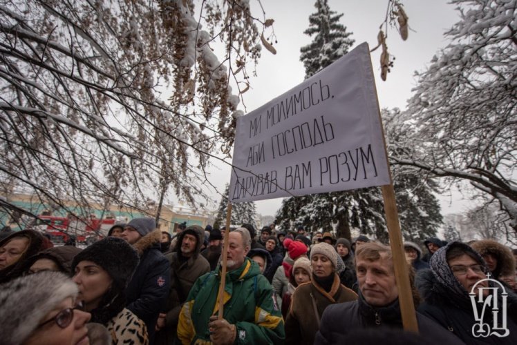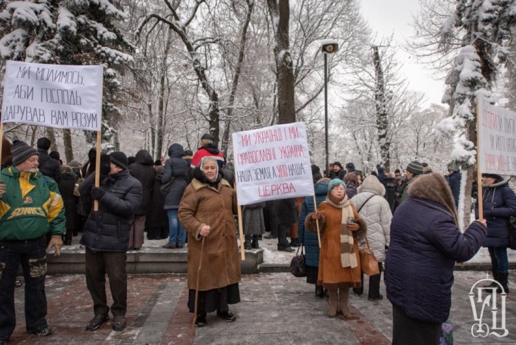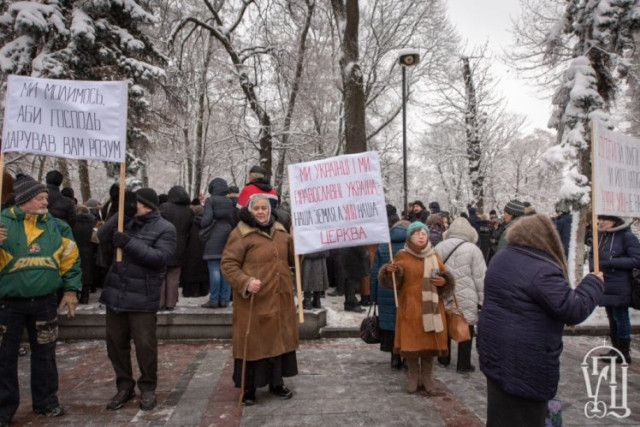 Віряни Української православної церкви Московського патріархату вийшли на мітинг під стіни Верховної Ради. Вони тримають у руках плакати з гаслами: «Ми молимось, аби Господь дарував вам розум», «Депутати, ви слуги народу чи його кати? Віруючі УПЦ — це ваш народ», «Ми українці, і ми православні. Україна — наша земля, а УПЦ — наша церква» тощо.
