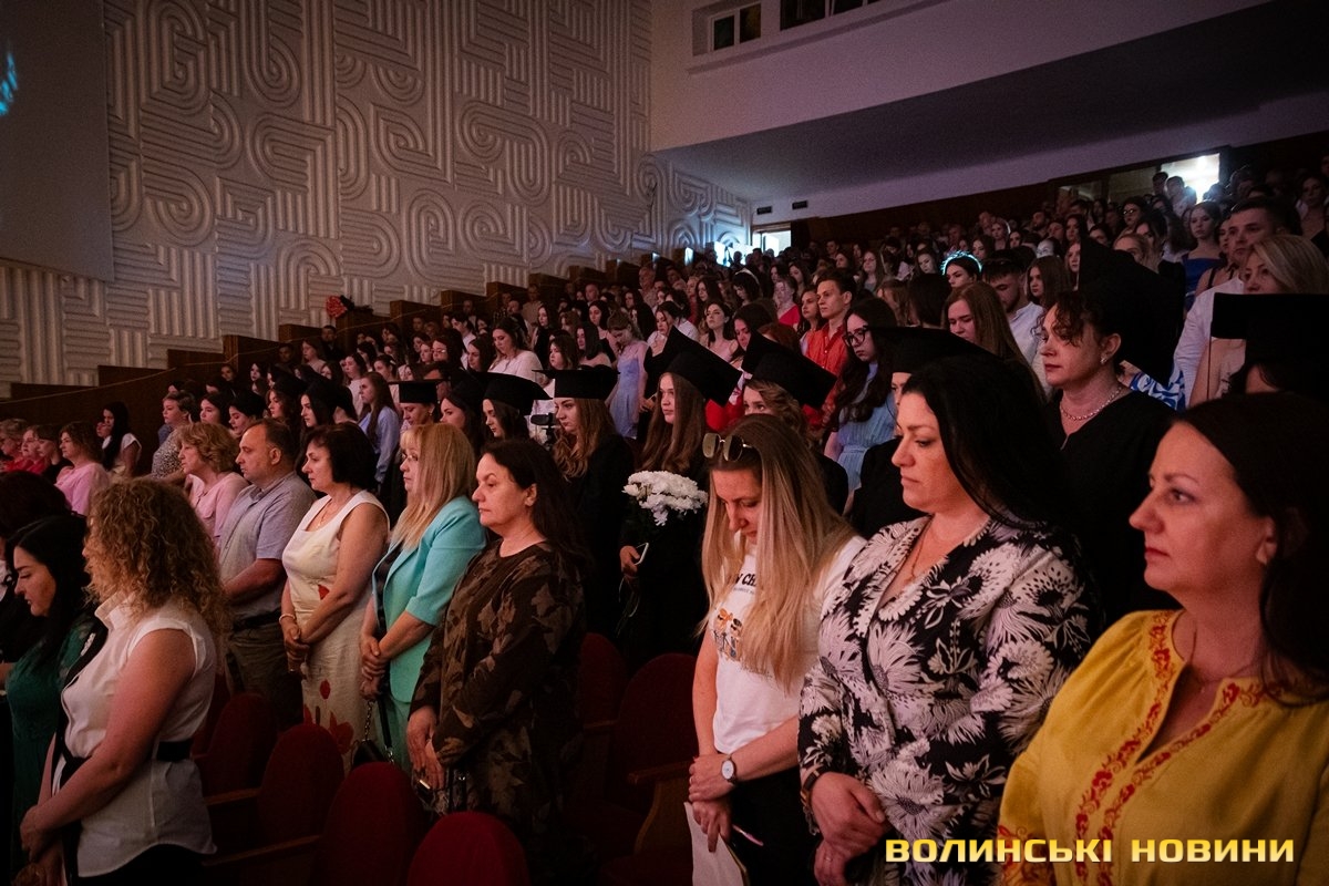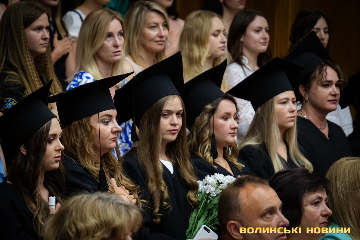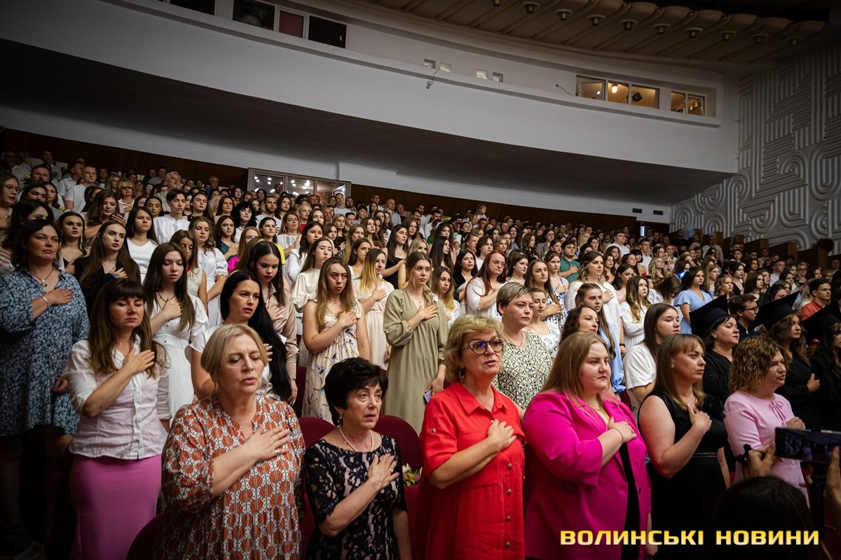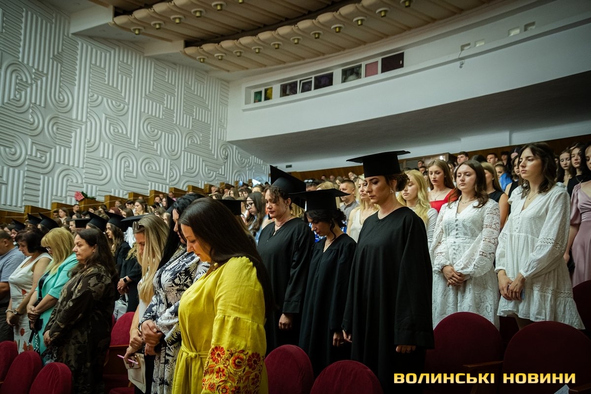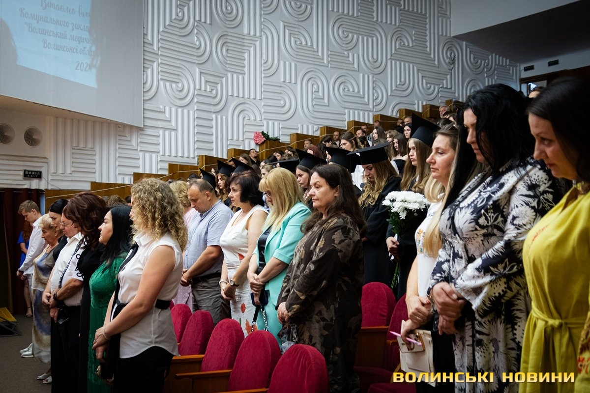 «Від імені колективу маю сьогодні честь привітати вас із однією з найяскравіших подій у вашому житті – отриманні диплома. Дорогі наші випускники, дякуємо вам за те, що обрали місцем свого професійного, духовного становлення Волинський медичний інститут. Заклад має свою історію, яка розпочалася у 1944 році. І нині ця історія отримала нове продовження.За кілька хвилин вам вручать дипломи, а завтра у вас настане новий етап життя – наче відкриється нова чиста сторінка. І хай ваші здобутки, ваші амбіції створять вам найкращу долю, адже ви обрали нелегку професію. Медицина – це жертовність, постійна відповідальність, це безмежна любов до людини і до світу», – не стримувала емоцій ректорка Волинського медінституту Тетяна Пастрик.Викладачі навчального закладу вітали колишніх студентів-магістрів, а бакалаврів запросили продовжити навчання. Побажання в усіх єдині: миру Україні, здоров’я, сил для ефективного служіння суспільству. А ще – щирі слова подяки нашим Героям, які своїми життями зупиняють агресора. На превеликий жаль, серед загиблих воїнів є і колишні студенти інституту. Їхню пам'ять присутні вшанували хвилиною мовчання та квітами…Читати ще: У Волинському медінституті − перший випуск екстрених медичних техніків
