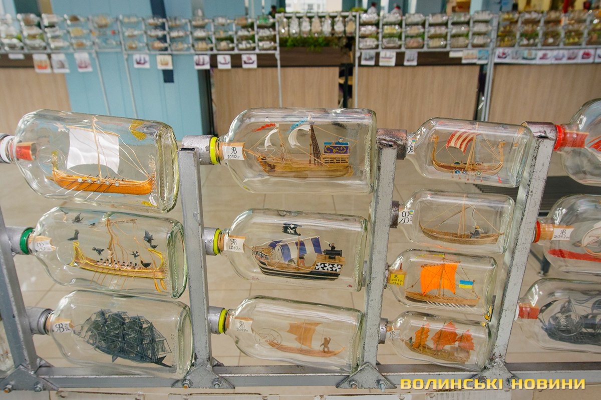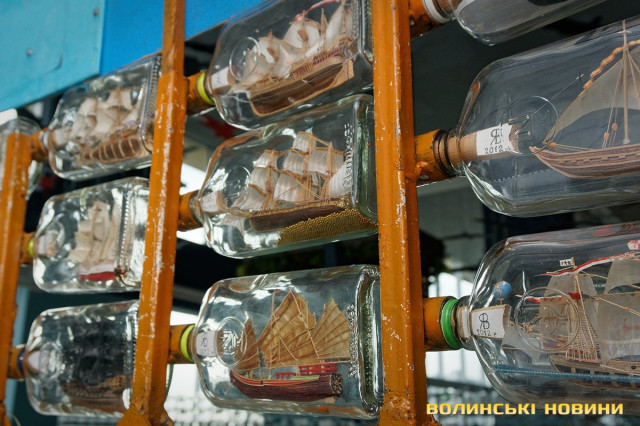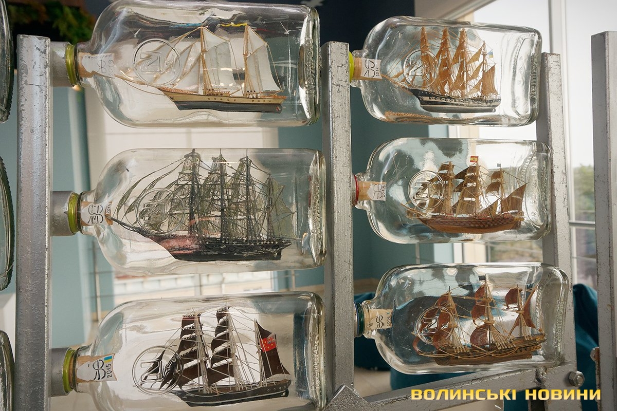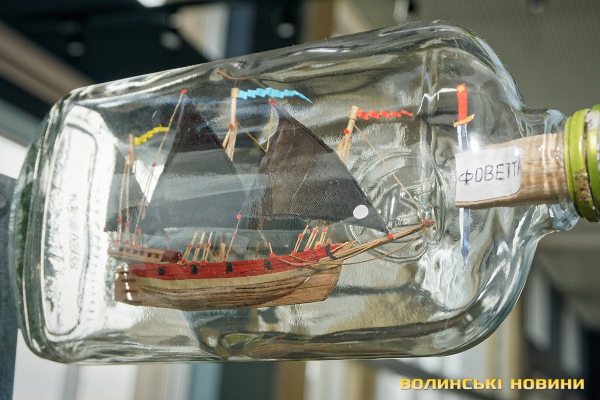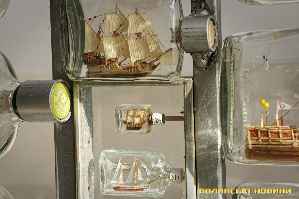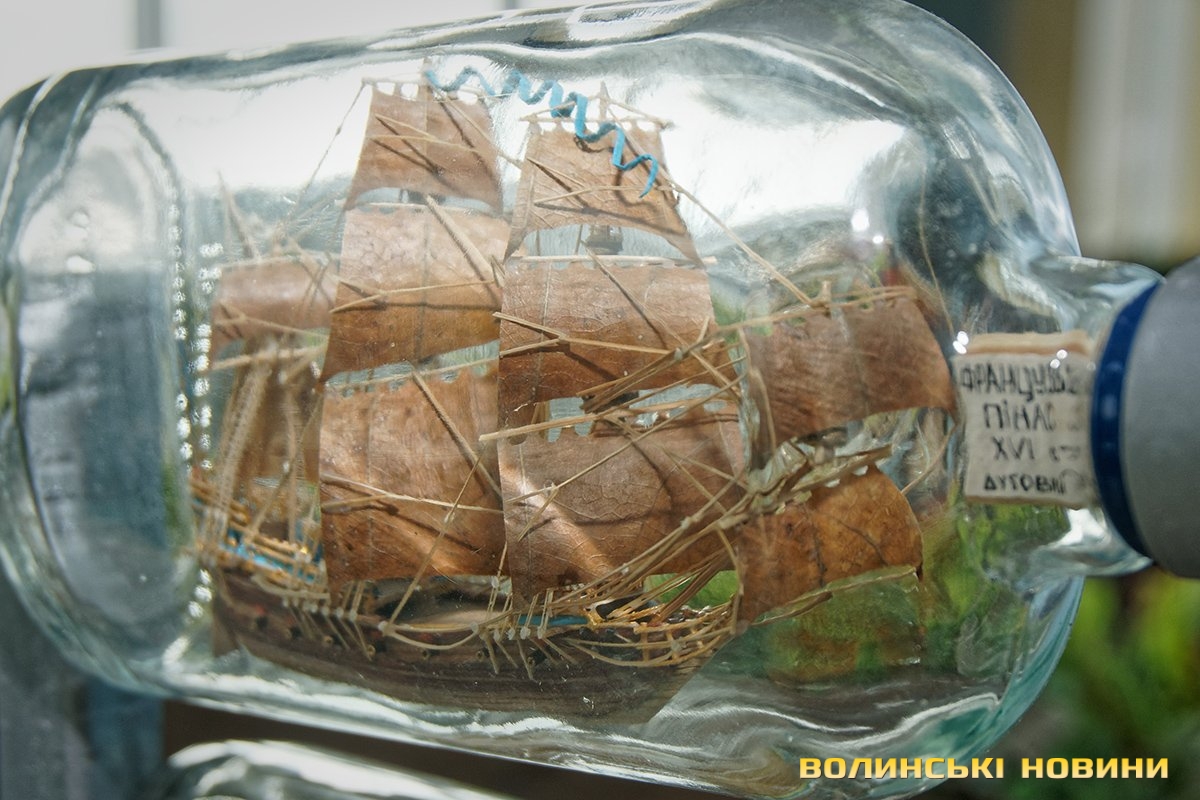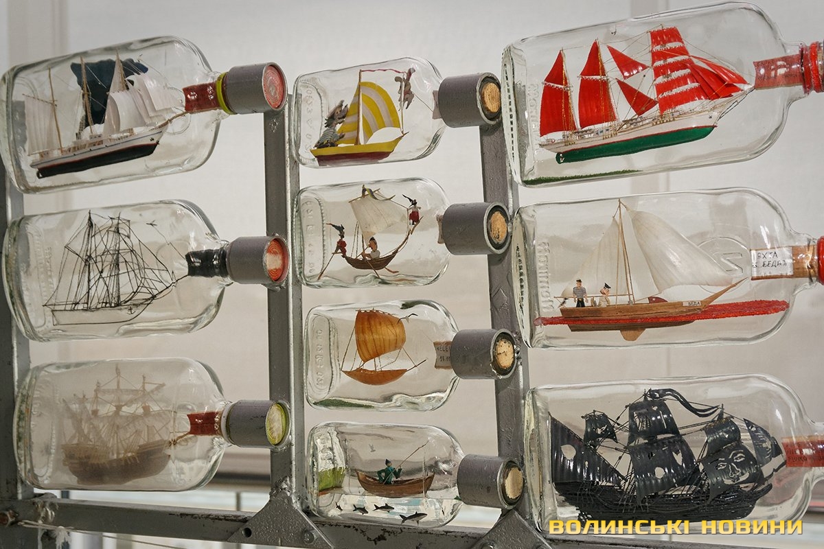 Відвідувачі можуть побачити понад 150 мініатюрних копій суден різних епох та народів. Більшість з них мають історичні прототипи, серед яких легендарні човни першовідкривачів нових континентів, азіатські та єгипетські кораблі, судна часів битв за панування на морі між Англією та Іспанією. Також є моделі кораблів, які всі ми бачили у мультфільмах – це і давньогрецьке судно «Арго» з історії про Ясона, і чайка трьох козаків, і човен, на якому Шрек помандрував за майбутнім королем.Тендітна модель складається з надзвичайно дрібних деталей зі шпону бамбуку, ниток та паперу. Залишається лише захоплюватися терплячістю та відточеністю рухів Володимира Ящука, якому вдається скріплювати їх між собою у пляшці. Коли корпус судна готовий – встановлюються щогли та вітрила. І тут фантазія майстра дійсно невичерпна! Вони у його колекції з: хвостиків вишень, ребер карася, скла ламп, квіткових пелюсток, шкірок кукурудзи та помідора, павутини, пір’я, перепелиного яйця, шкірки банана, цибулі та іншого – усього біля 70 моделей з різних матеріалів. Беззаперечним «лідером» серед них із варіацій застосування є часник. Аж цілих 12 моделей з різних його частин змайстрував Володимир Ящук.Окрема гордість автора – вдосконалені способи кріплення мініатюри всередині пляшки. Здається просто? Насправді ж, Володимир Ящук запропонував їх аж 15 варіантів. Кожен має свої переваги і недоліки, тож використовується, залежно від конструкції та композиційного задуму розміщення моделі. Інколи можна упор щоглою застосувати, інколи – підвісити на волосині, а часом і на голку встановити. Вдосконалює майстер і проекції човників – є у його колекції такі, що зображають судно не лише у традиційному вигляді «збоку», але й і з корми та носа.Експозиція мініатюрних суден працюватиме впродовж місяця. Тож запрошуємо усіх охочих завітати до «ART GALLERY», щоб на власні очі побачити дивовижні витвори Володимира Ящука.