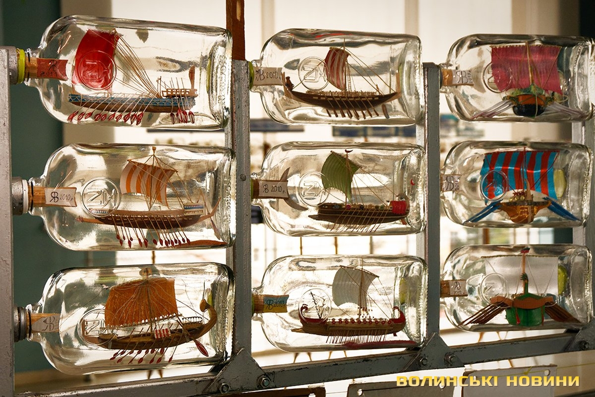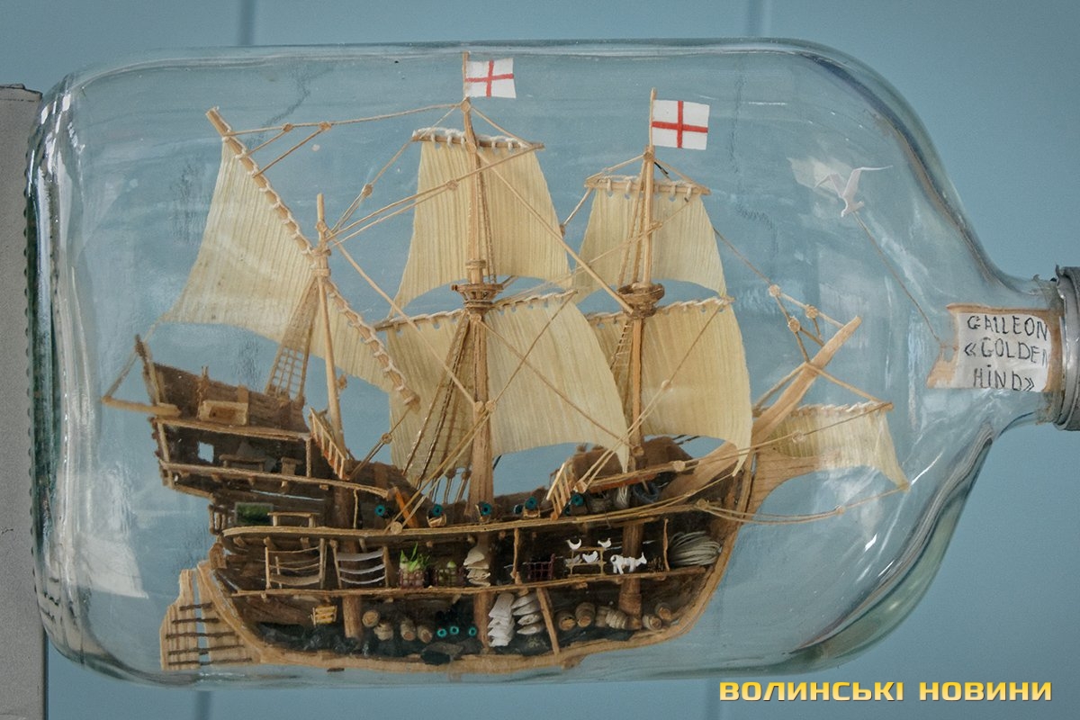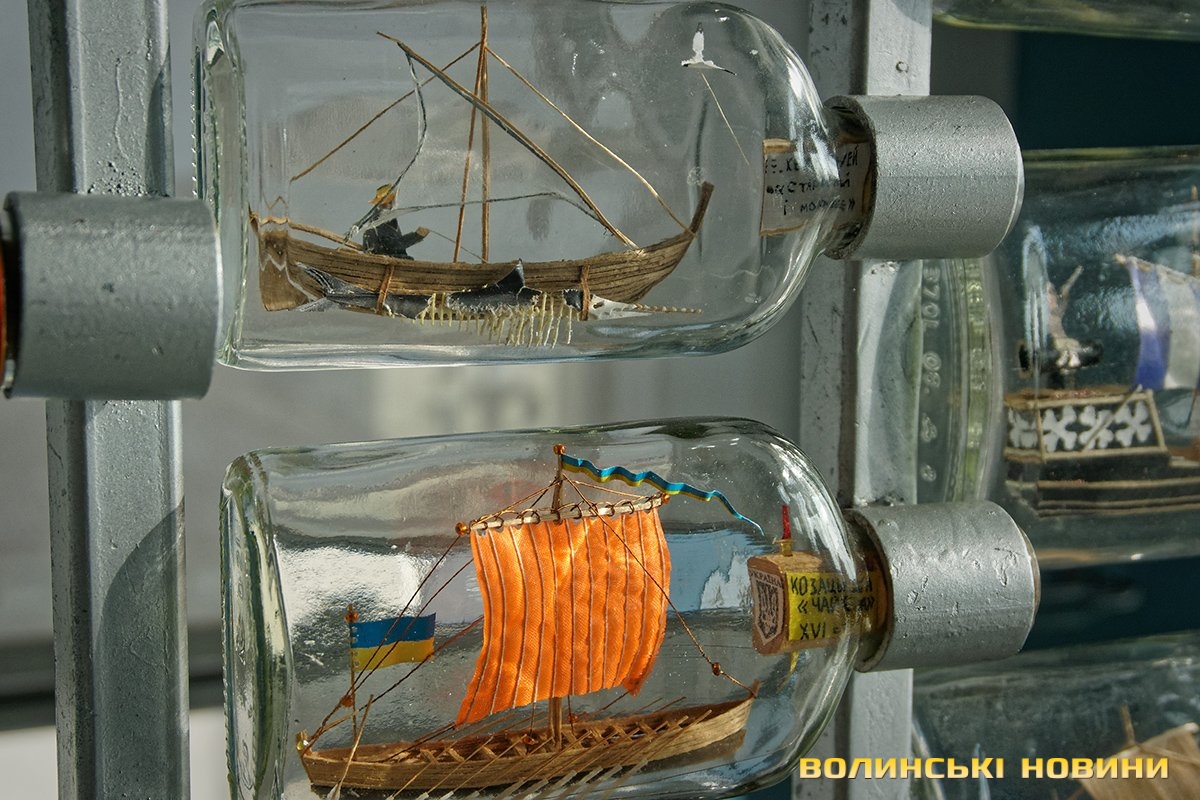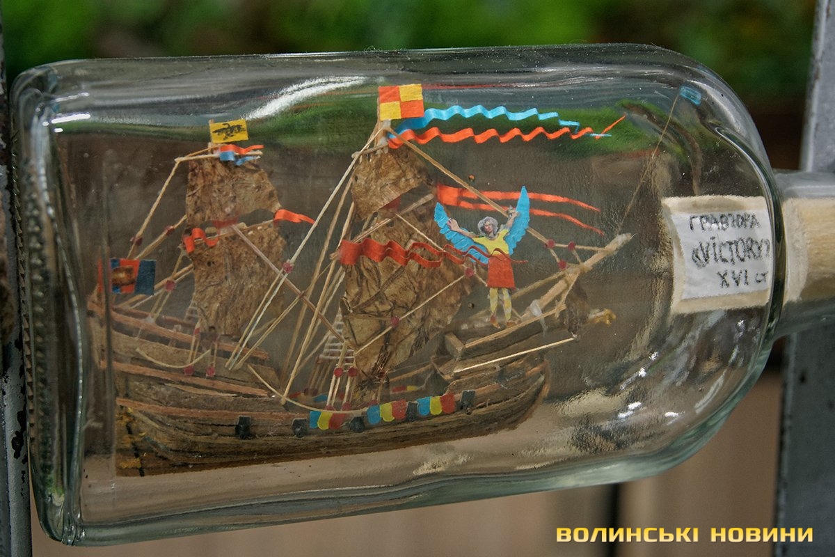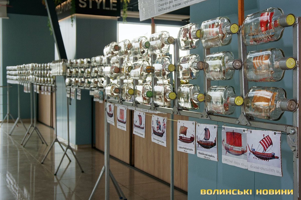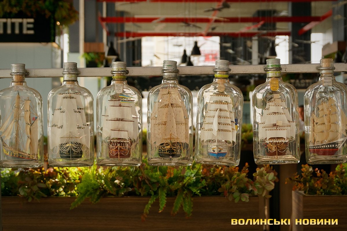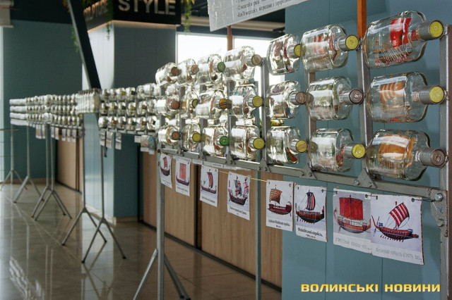 Відвідувачі можуть побачити понад 150 мініатюрних копій суден різних епох та народів. Більшість з них мають історичні прототипи, серед яких легендарні човни першовідкривачів нових континентів, азіатські та єгипетські кораблі, судна часів битв за панування на морі між Англією та Іспанією. Також є моделі кораблів, які всі ми бачили у мультфільмах – це і давньогрецьке судно «Арго» з історії про Ясона, і чайка трьох козаків, і човен, на якому Шрек помандрував за майбутнім королем.Тендітна модель складається з надзвичайно дрібних деталей зі шпону бамбуку, ниток та паперу. Залишається лише захоплюватися терплячістю та відточеністю рухів Володимира Ящука, якому вдається скріплювати їх між собою у пляшці. Коли корпус судна готовий – встановлюються щогли та вітрила. І тут фантазія майстра дійсно невичерпна! Вони у його колекції з: хвостиків вишень, ребер карася, скла ламп, квіткових пелюсток, шкірок кукурудзи та помідора, павутини, пір’я, перепелиного яйця, шкірки банана, цибулі та іншого – усього біля 70 моделей з різних матеріалів. Беззаперечним «лідером» серед них із варіацій застосування є часник. Аж цілих 12 моделей з різних його частин змайстрував Володимир Ящук.Окрема гордість автора – вдосконалені способи кріплення мініатюри всередині пляшки. Здається просто? Насправді ж, Володимир Ящук запропонував їх аж 15 варіантів. Кожен має свої переваги і недоліки, тож використовується, залежно від конструкції та композиційного задуму розміщення моделі. Інколи можна упор щоглою застосувати, інколи – підвісити на волосині, а часом і на голку встановити. Вдосконалює майстер і проекції човників – є у його колекції такі, що зображають судно не лише у традиційному вигляді «збоку», але й і з корми та носа.Експозиція мініатюрних суден працюватиме впродовж місяця. Тож запрошуємо усіх охочих завітати до «ART GALLERY», щоб на власні очі побачити дивовижні витвори Володимира Ящука.