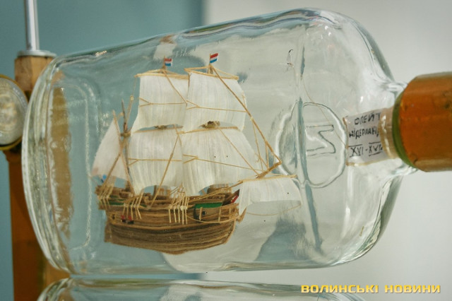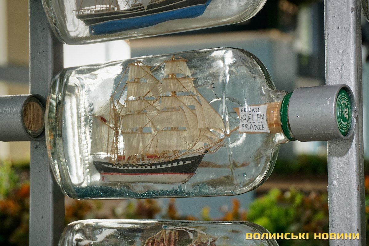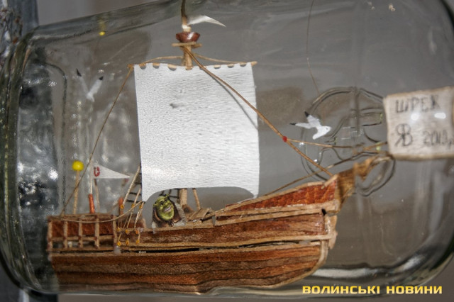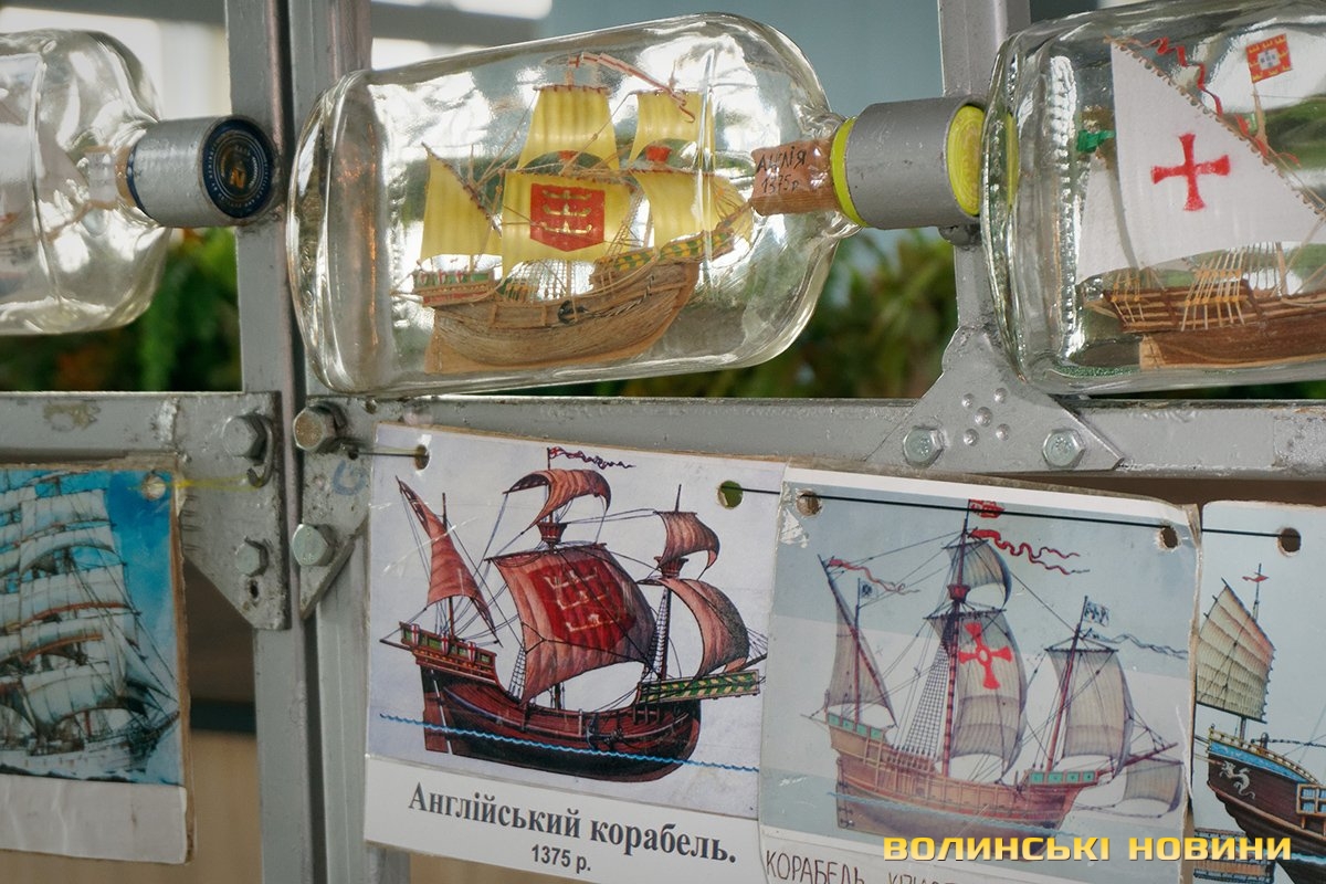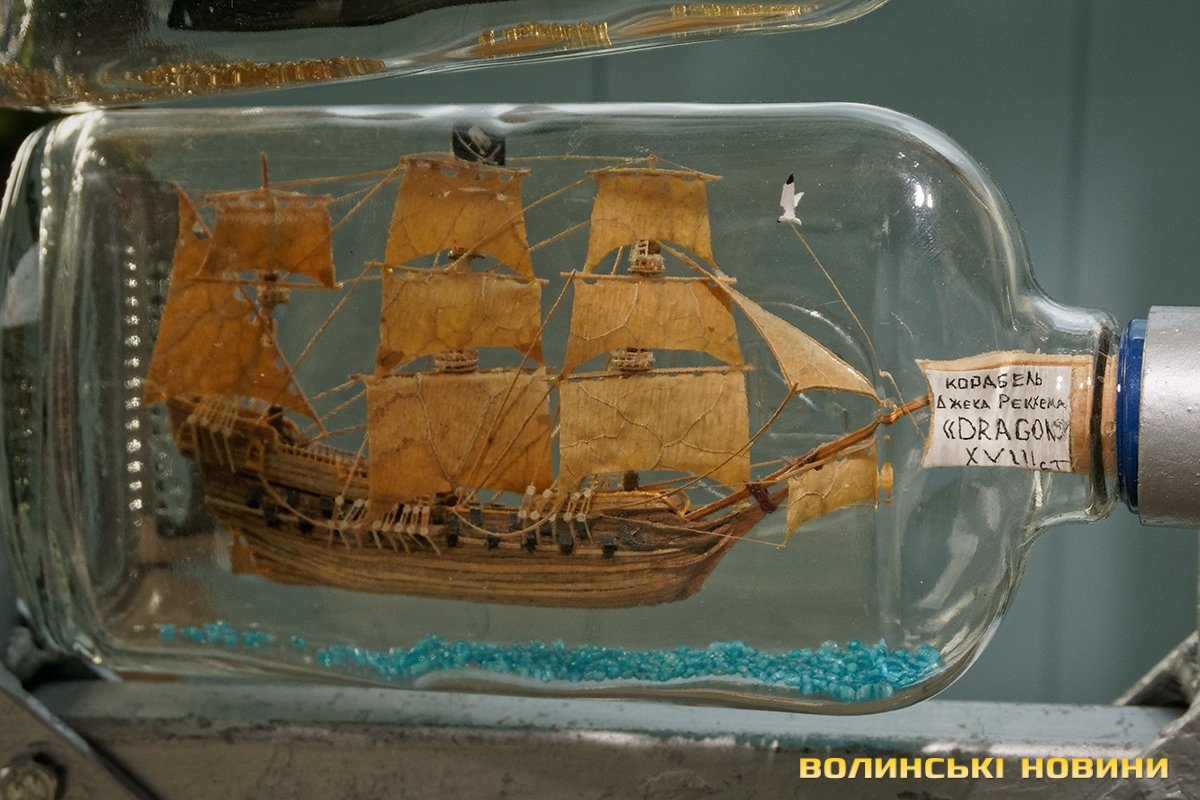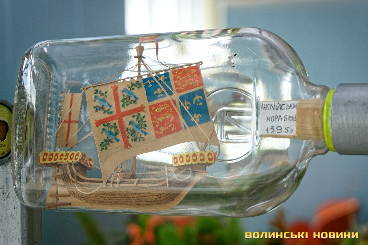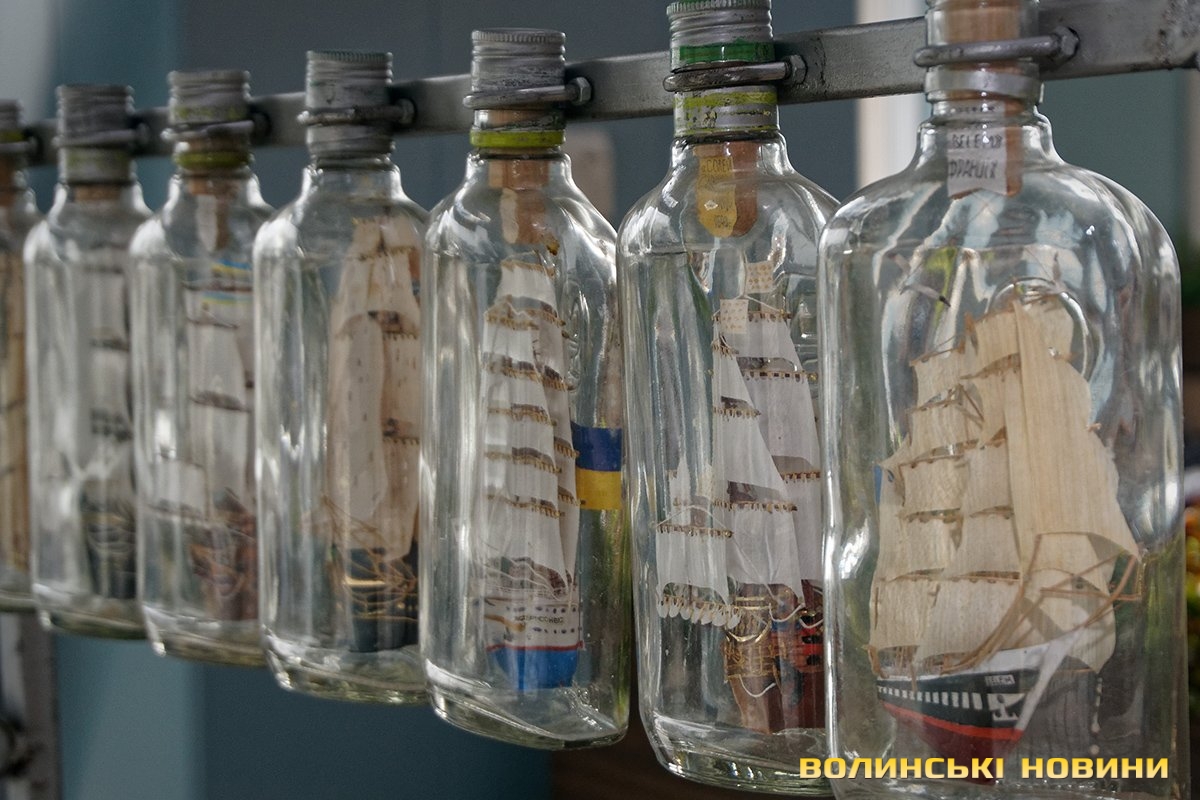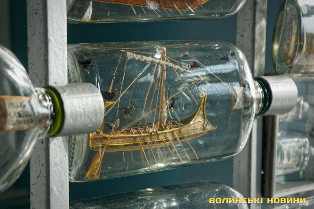 Відвідувачі можуть побачити понад 150 мініатюрних копій суден різних епох та народів. Більшість з них мають історичні прототипи, серед яких легендарні човни першовідкривачів нових континентів, азіатські та єгипетські кораблі, судна часів битв за панування на морі між Англією та Іспанією. Також є моделі кораблів, які всі ми бачили у мультфільмах – це і давньогрецьке судно «Арго» з історії про Ясона, і чайка трьох козаків, і човен, на якому Шрек помандрував за майбутнім королем.Тендітна модель складається з надзвичайно дрібних деталей зі шпону бамбуку, ниток та паперу. Залишається лише захоплюватися терплячістю та відточеністю рухів Володимира Ящука, якому вдається скріплювати їх між собою у пляшці. Коли корпус судна готовий – встановлюються щогли та вітрила. І тут фантазія майстра дійсно невичерпна! Вони у його колекції з: хвостиків вишень, ребер карася, скла ламп, квіткових пелюсток, шкірок кукурудзи та помідора, павутини, пір’я, перепелиного яйця, шкірки банана, цибулі та іншого – усього біля 70 моделей з різних матеріалів. Беззаперечним «лідером» серед них із варіацій застосування є часник. Аж цілих 12 моделей з різних його частин змайстрував Володимир Ящук.Окрема гордість автора – вдосконалені способи кріплення мініатюри всередині пляшки. Здається просто? Насправді ж, Володимир Ящук запропонував їх аж 15 варіантів. Кожен має свої переваги і недоліки, тож використовується, залежно від конструкції та композиційного задуму розміщення моделі. Інколи можна упор щоглою застосувати, інколи – підвісити на волосині, а часом і на голку встановити. Вдосконалює майстер і проекції човників – є у його колекції такі, що зображають судно не лише у традиційному вигляді «збоку», але й і з корми та носа.Експозиція мініатюрних суден працюватиме впродовж місяця. Тож запрошуємо усіх охочих завітати до «ART GALLERY», щоб на власні очі побачити дивовижні витвори Володимира Ящука.