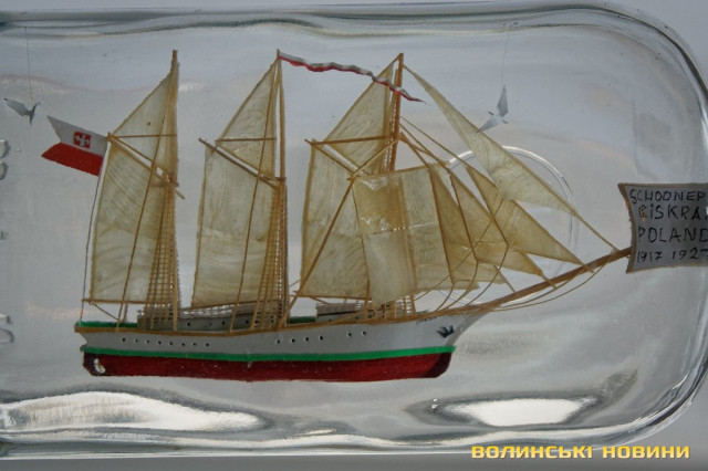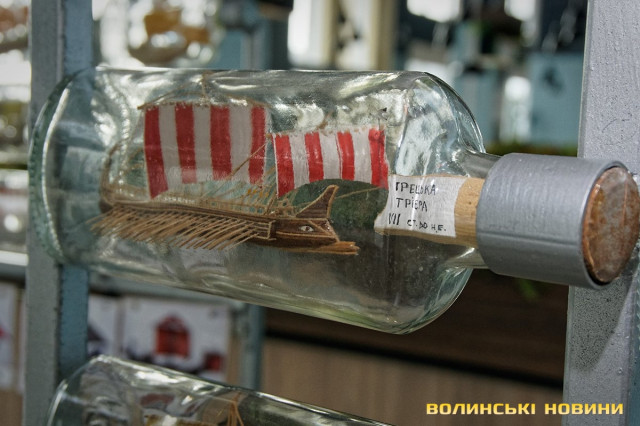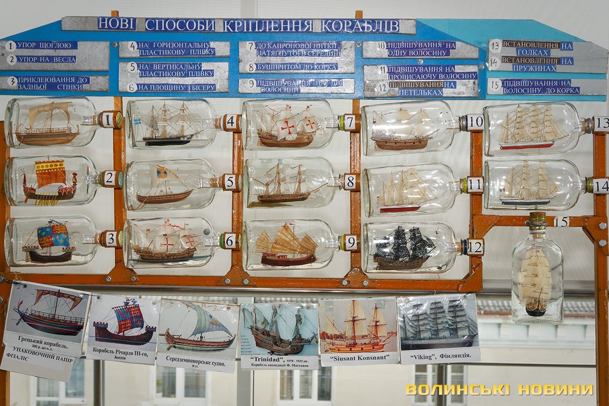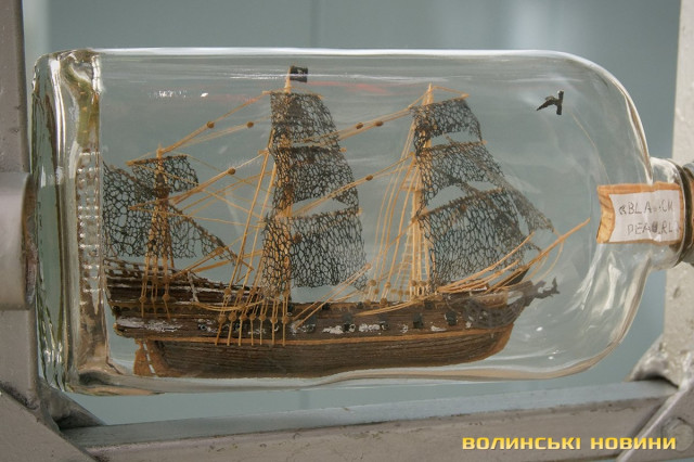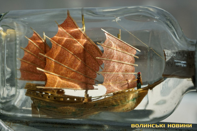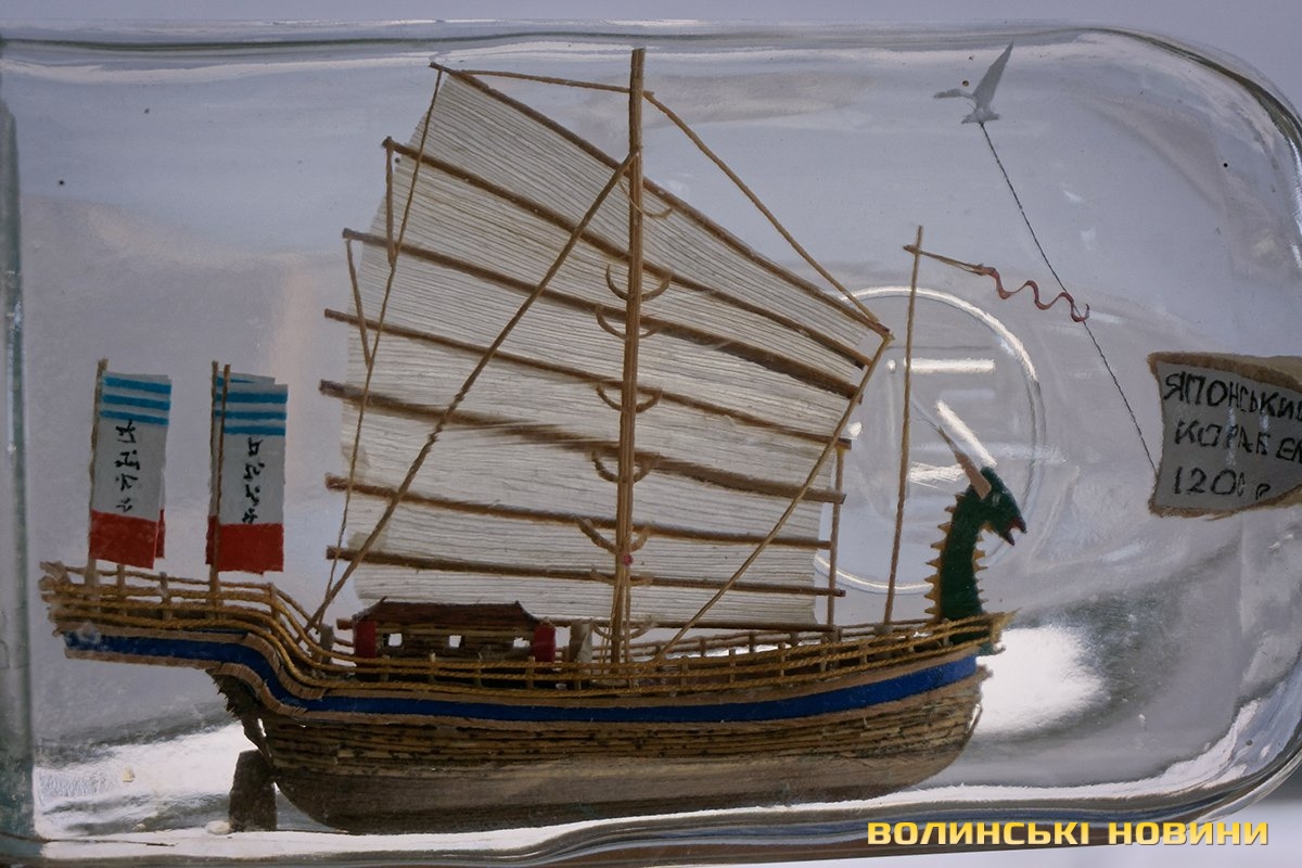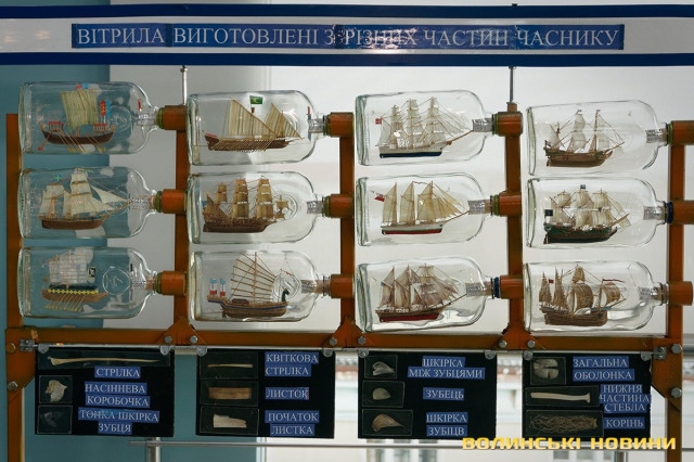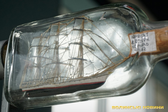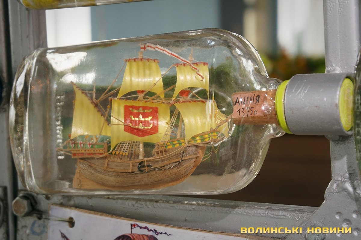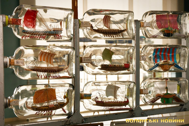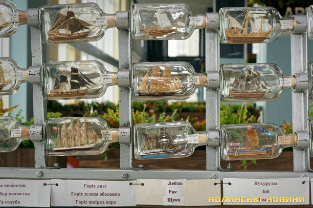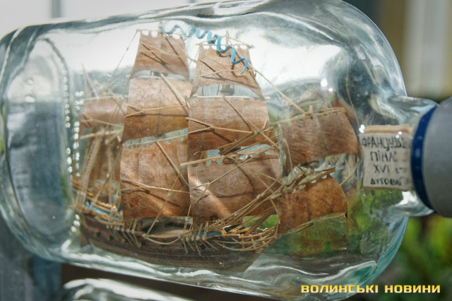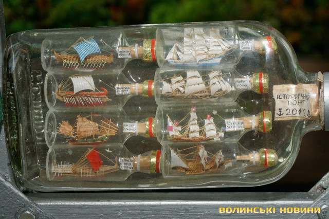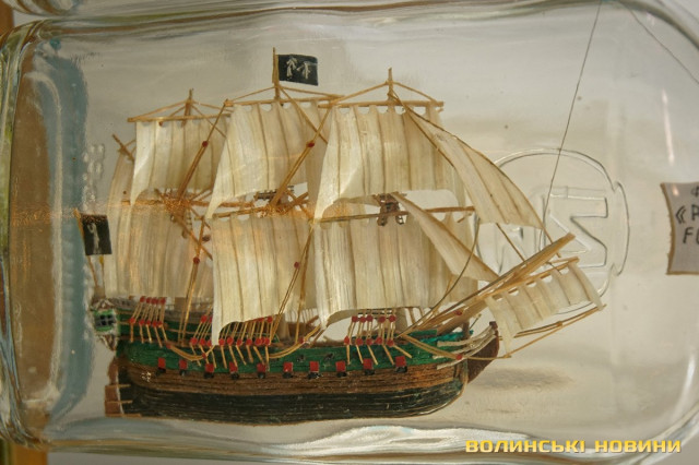 Відвідувачі можуть побачити понад 150 мініатюрних копій суден різних епох та народів. Більшість з них мають історичні прототипи, серед яких легендарні човни першовідкривачів нових континентів, азіатські та єгипетські кораблі, судна часів битв за панування на морі між Англією та Іспанією. Також є моделі кораблів, які всі ми бачили у мультфільмах – це і давньогрецьке судно «Арго» з історії про Ясона, і чайка трьох козаків, і човен, на якому Шрек помандрував за майбутнім королем.Тендітна модель складається з надзвичайно дрібних деталей зі шпону бамбуку, ниток та паперу. Залишається лише захоплюватися терплячістю та відточеністю рухів Володимира Ящука, якому вдається скріплювати їх між собою у пляшці. Коли корпус судна готовий – встановлюються щогли та вітрила. І тут фантазія майстра дійсно невичерпна! Вони у його колекції з: хвостиків вишень, ребер карася, скла ламп, квіткових пелюсток, шкірок кукурудзи та помідора, павутини, пір’я, перепелиного яйця, шкірки банана, цибулі та іншого – усього біля 70 моделей з різних матеріалів. Беззаперечним «лідером» серед них із варіацій застосування є часник. Аж цілих 12 моделей з різних його частин змайстрував Володимир Ящук.Окрема гордість автора – вдосконалені способи кріплення мініатюри всередині пляшки. Здається просто? Насправді ж, Володимир Ящук запропонував їх аж 15 варіантів. Кожен має свої переваги і недоліки, тож використовується, залежно від конструкції та композиційного задуму розміщення моделі. Інколи можна упор щоглою застосувати, інколи – підвісити на волосині, а часом і на голку встановити. Вдосконалює майстер і проекції човників – є у його колекції такі, що зображають судно не лише у традиційному вигляді «збоку», але й і з корми та носа.Експозиція мініатюрних суден працюватиме впродовж місяця. Тож запрошуємо усіх охочих завітати до «ART GALLERY», щоб на власні очі побачити дивовижні витвори Володимира Ящука.