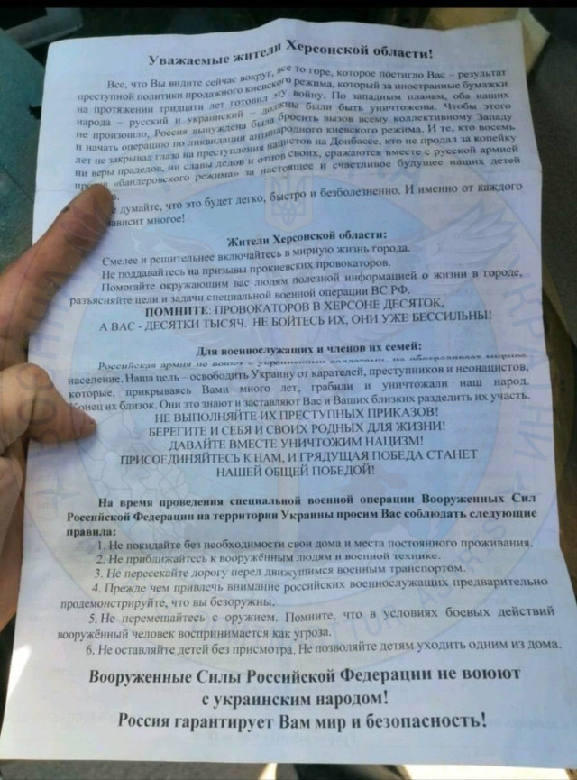 У листівках, які поширюють в Херсоні окупанти, винними в російській агресії називають самих українців та обрану ними владу: «Горе, що спіткало вас, – результат злочинної політики київського режиму».
