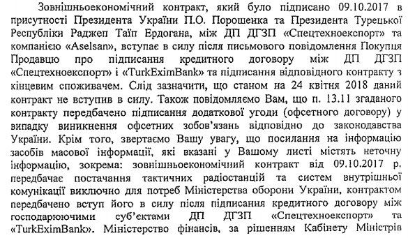 Також у наведених матеріалах йдеться про зацікавленість військової прокуратури зовнішньоекономічним контрактом, який був підписаний у жовтні 2017 року між ДП «Спецтехноекспорт» та компанією «Aselsan» в присутності президента України Петра Порошенка та президента Турецької Республіки Раджепа Таїпа Ердогана.