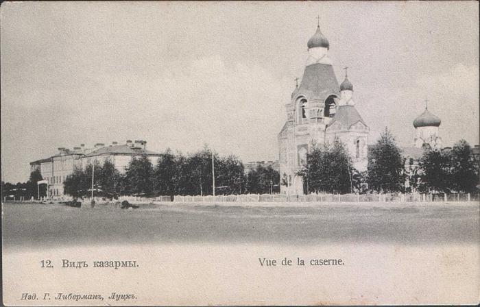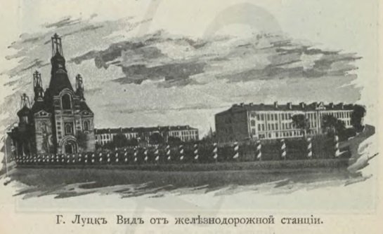 Відтепер кожен, хто приїжджав у Луцьк залізницею, при виході з приміщення вокзалу в місто бачив головний фасад церкви і казарми, які тягнулися в два боки від храму.Поштівка 1903 року