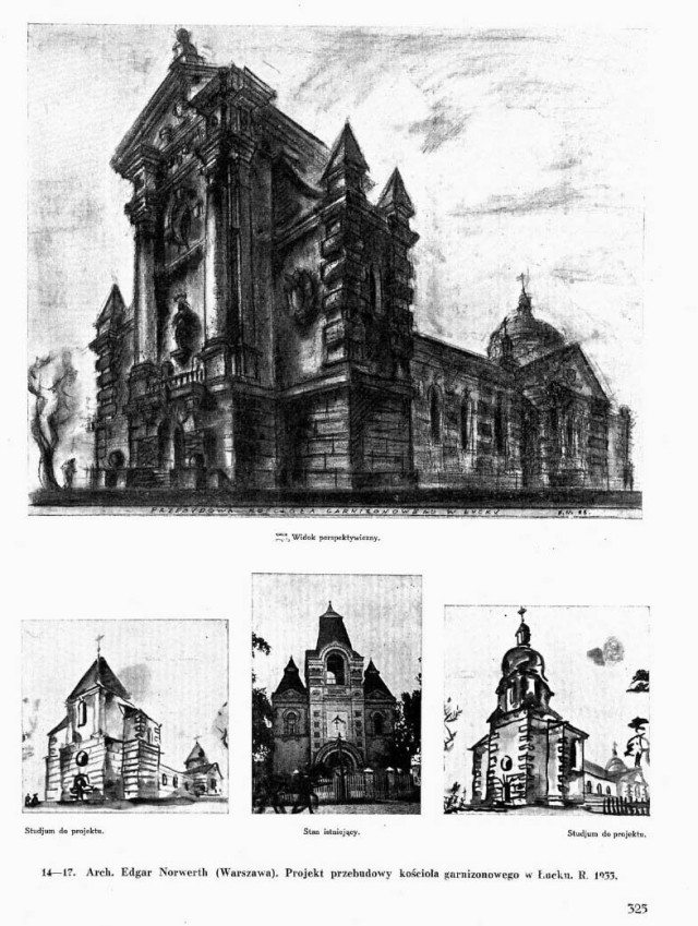 Першою візуалізацією перебудови храму була ідея дуже шанованого і знаного варшавського архітектора Едгара Норверта 1933 року. Він зробив кілька ескізних пропозицій, які опублікували в журналі «Архітектура і будівництво». Норверт запроектував дуже багато громадських та житлових споруд в багатьох містах тодішньої Польщі. Серед них вокзали, житлові комплекси, пошти, храми, фабрики, казино, санаторій і навіть генеральний план Любліна.Обставини пропозицій Норверта для Луцька маловідомі, тому поки що важко сказати, чому не реалізували його ідеї. Можливо, до повноцінного проєкту перебудови далі ескізів і не дійшло.
