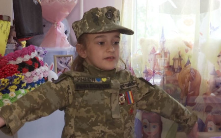 Дівчинка не натішиться формою, яку для неї зробили на спецзамовлення військові 14-ї окремої механізованої бригади імені князя Романа Великого. Іринці 7, а її військові вже, каже, призначили найкращим командиром. «Найкращий командир написано, тут янгол («позивний» дівчинки, – ред.), тут Ірина Васильєва», – показує дитина.