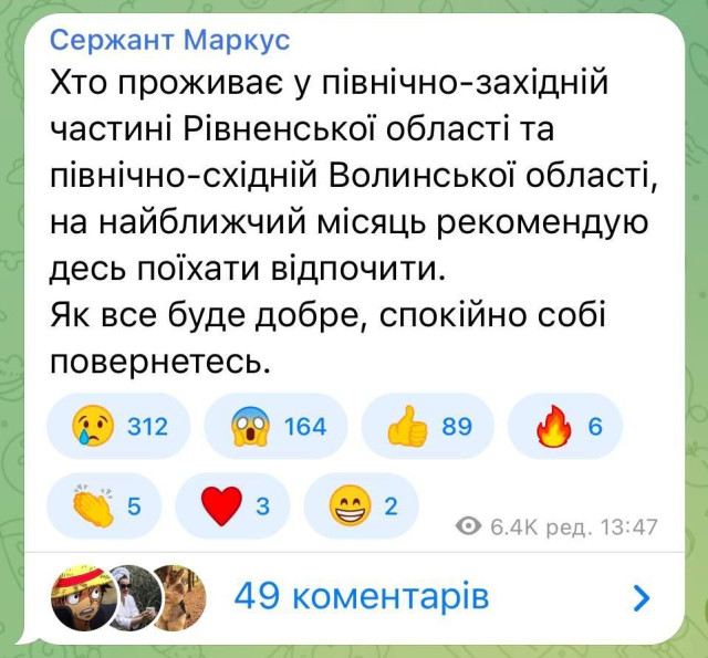 «Хто проживає у північно-західній частині Рівненської області та північно-східній Волинської області, на найближчий місяць рекомендую десь поїхати відпочити. Як все буде добре, спокійно собі повернетесь», – йдеться в повідомленні.