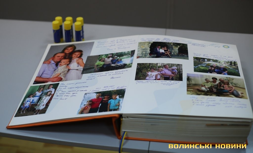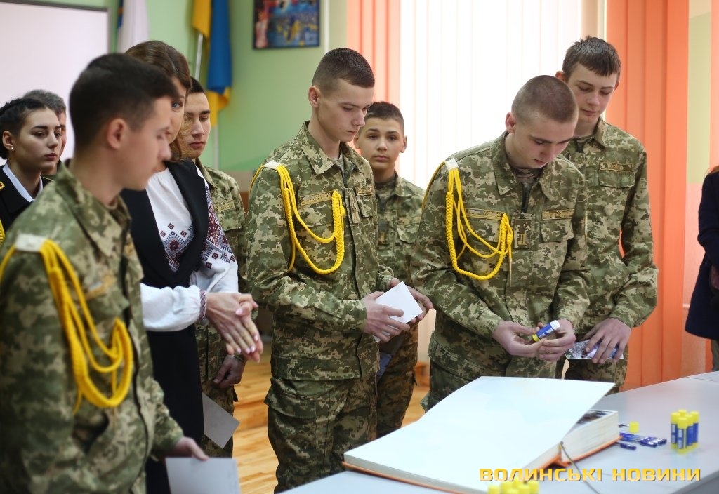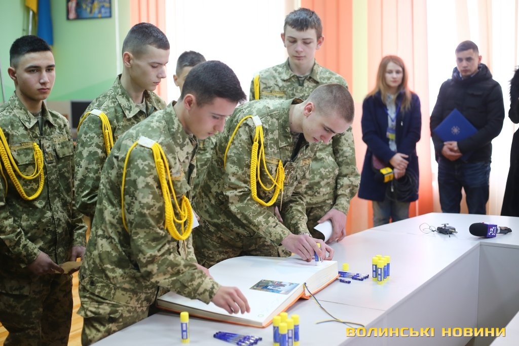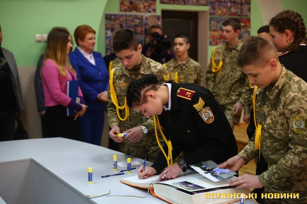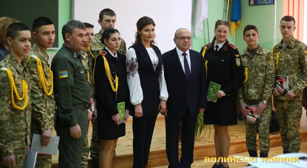 Розпочався візит першої леді на Волинь 21 лютого з відвідин обласного ліцею з посиленою військово-фізичною підготовкою. Там Марина Порошенко заповнила разом з ліцеїстами новий розділ «Книги Миру», де свої побажання записують діти тих, хто боронить Україну.