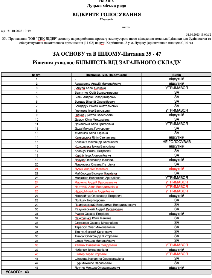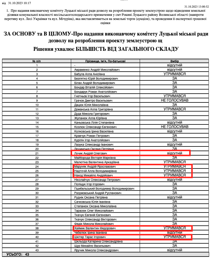 Але не у всіх голосуваннях «Свідомі» такі пасивні. Адже депутати політсили Андрія Покровського зі всіх сил намагаються проштовхнути рішення про затвердження ТзОВ «Казкова оселя» (співвласником якої є Покровський) землеустрою щодо зміни цільового призначення на вул. Архітектора Метельницького у Луцьку. Ділянка, що розміщена поряд зі згаданою і становить з нею один комплекс, фігурує в кримінальному провадженні щодо незаконної зміни цільового призначення.
