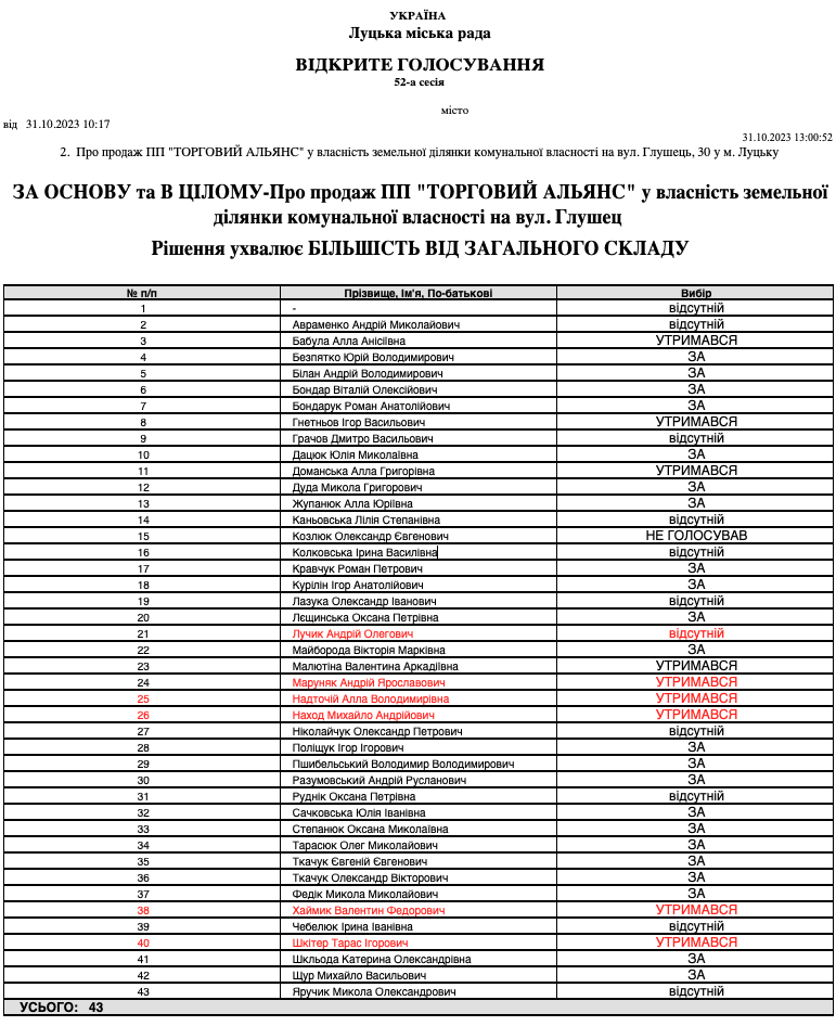 Депутатська фракція ГР «Свідомі» чи не єдині не голосували за жодне з питань, які принесли бюджету Луцька мільйони гривень. Наприклад, питання про надання дозволу на розроблення документації для виставлення на аукціон земельної ділянки в Рокинях. Відповідно до даних Департаменту містобудування, земельних ресурсів та реклами міськради, мінімальна ціна продажу ділянки – 2 280 000 грн (це близько 150 гривень за квадратний метр), а очікувана – 2 763 600 грн (~ 200 грн/кв. м).Не підтримали «Свідомі» й питання про продаж земельної ділянки у Луцьку компанії «Торговий Альянс». До слова, ціна становила 680 601 грн (351,55грн/кв. м). На цій ділянці в компанії вже розміщений її обʼєкт нерухомості.Ще 13 питань стосувалися надання в оренду земельних ділянок, на яких вже розташовані склади та виробничі приміщення. Залежно від оцінки, за місяць оренда приноситиме міському бюджету від 216 до 433 тисяч гривень. Жодне з цих питань «Свідомі» також не підтримали, хоча продаж ділянок принесе бюджету міста близько 3,4 мільйона гривень, а від оренди до казни щомісячно надходитиме від 216 до 433 тисяч.Зазначимо, що ці надходження до місцевого бюджету особливо важливі зараз, коли в громад забрали військовий ПДФО, який тепер сплачують до центрального бюджету, а відтак Луцьк має менше коштів, у тому числі для Сил оборони України.