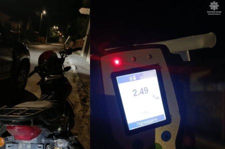 Патрульні зупинили мотоцикл. Спілкуючись із водієм, помітили у нього ознаки алкогольного сп’яніння. 23-річний громадянин пройшов огляд на місці за допомогою приладу «Драгер». Результат – 2,49 проміле, що перевищує максимально допустиму норму в майже 13 разів.