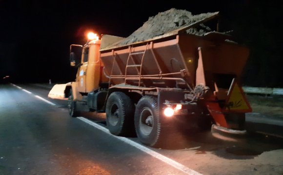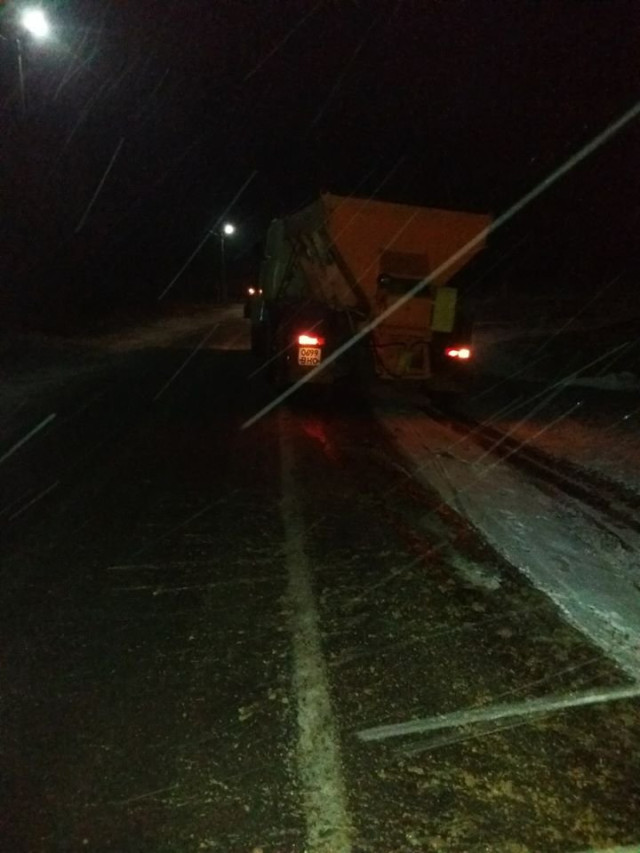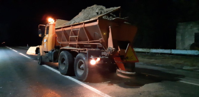 На окремих ділянках доріг завершуються роботи з оброблення проїзної частини протиожеледними матеріалами.